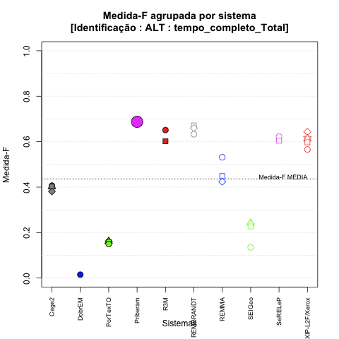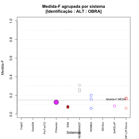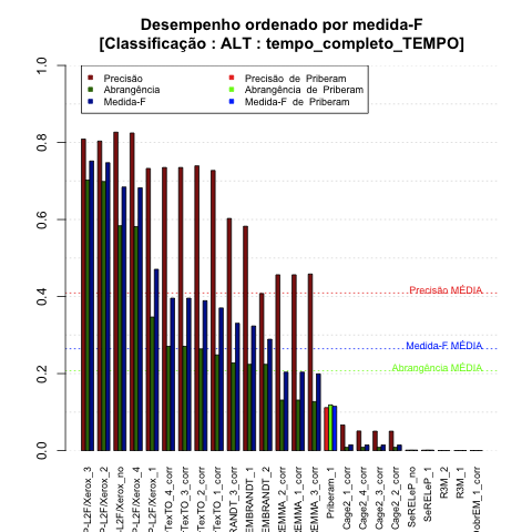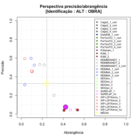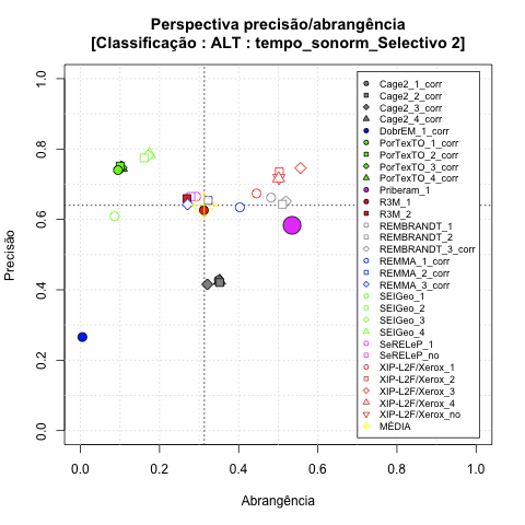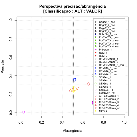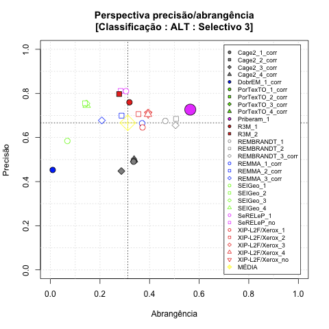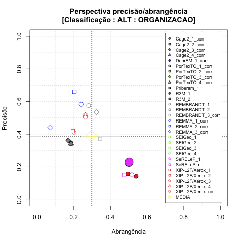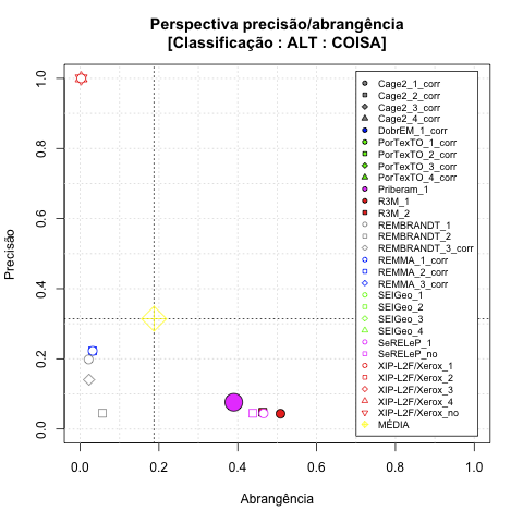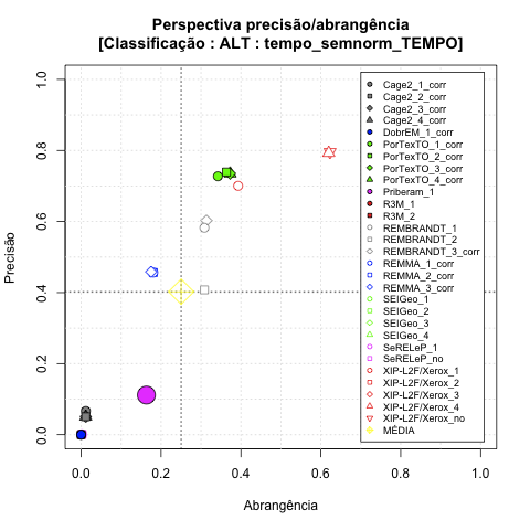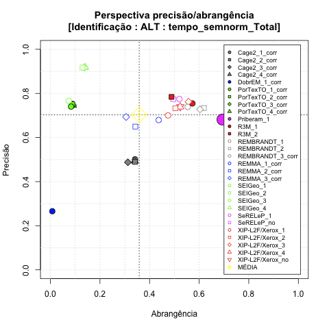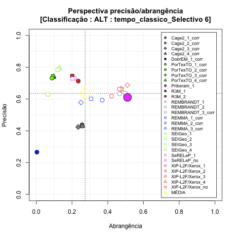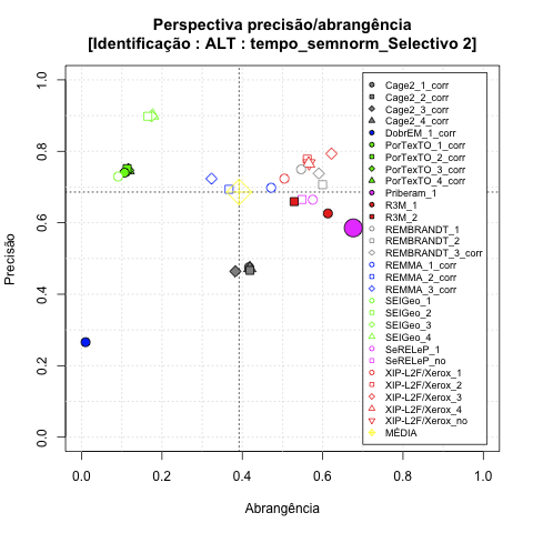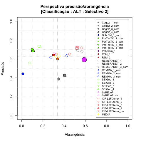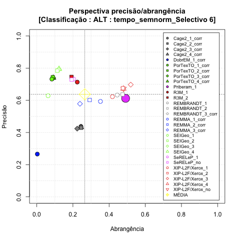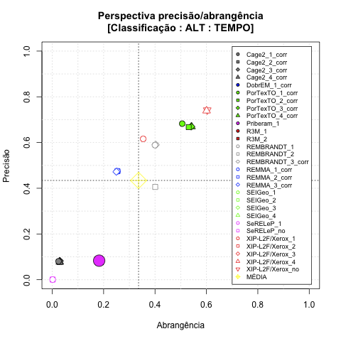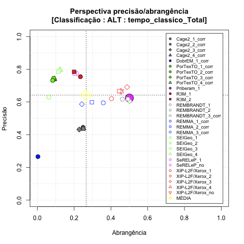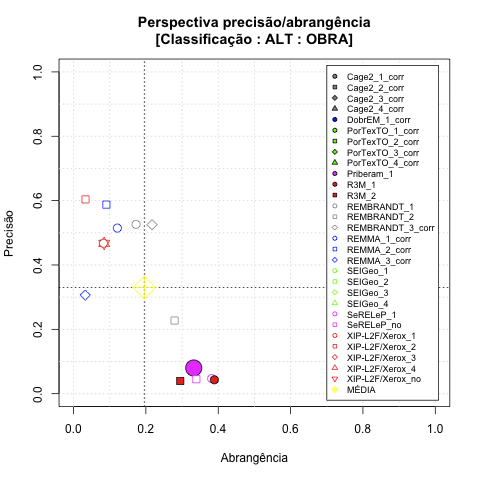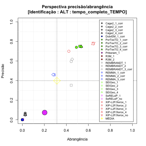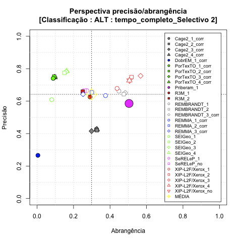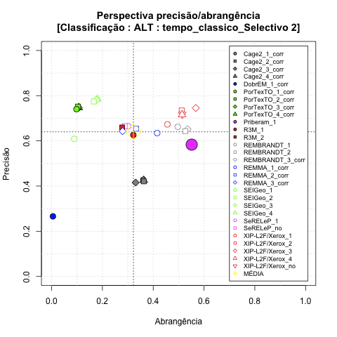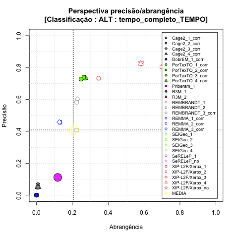 - com tamanho maior, no caso de gráficos comparativos precisão/abrangência e também no caso dos gráficos apenas com medida-F;