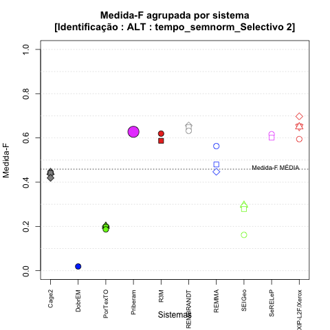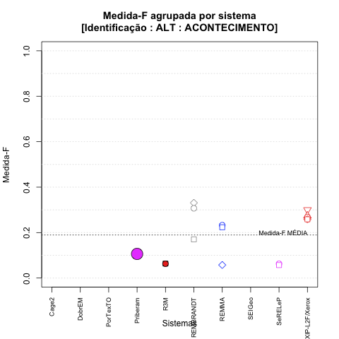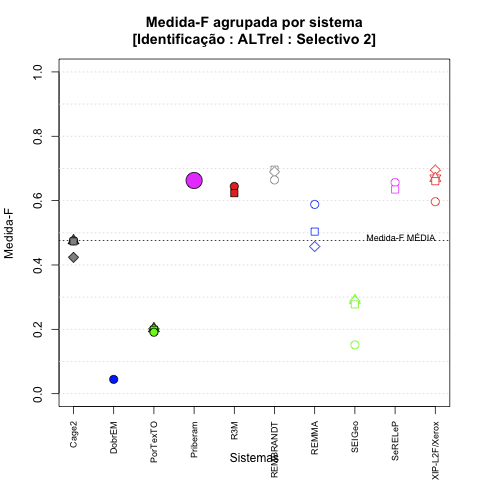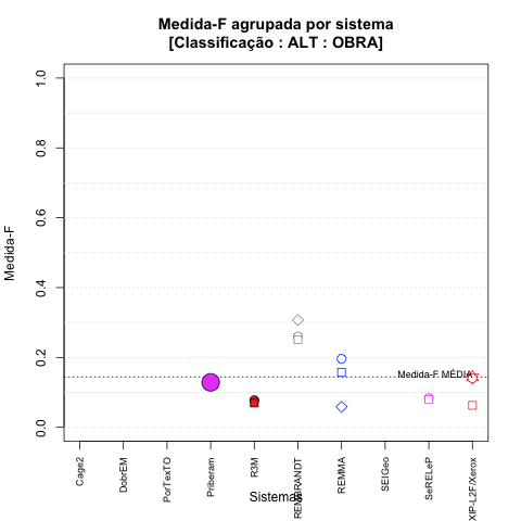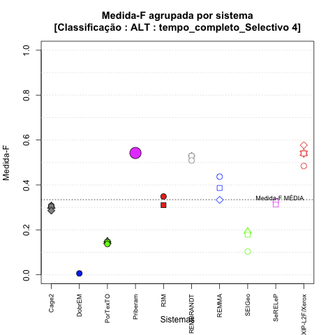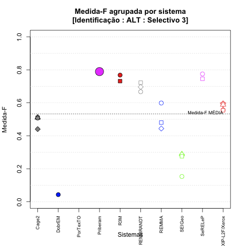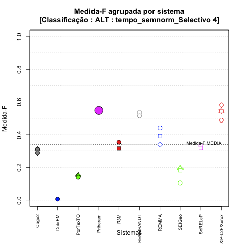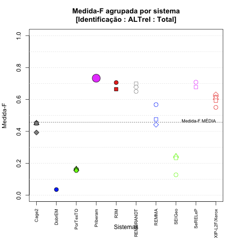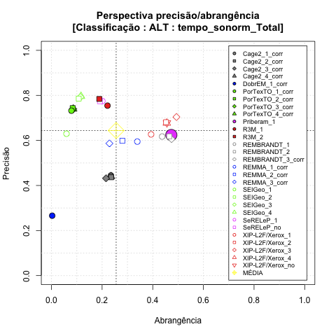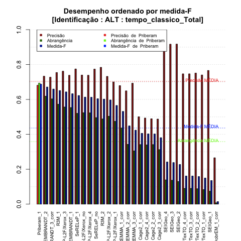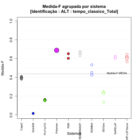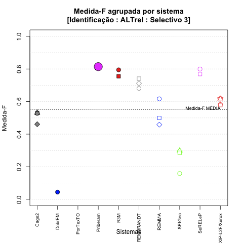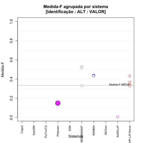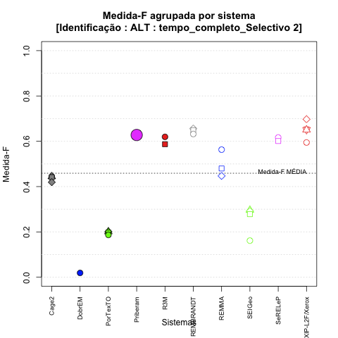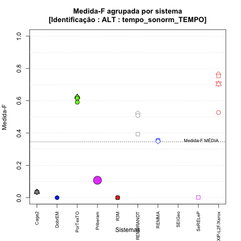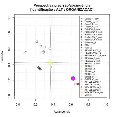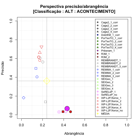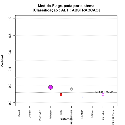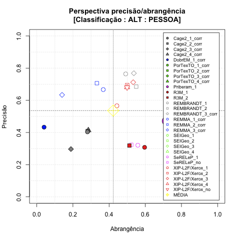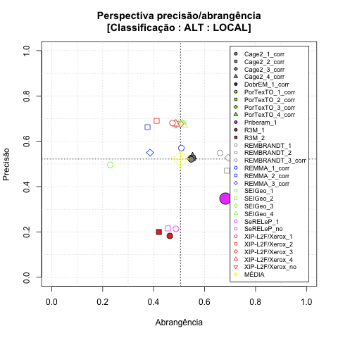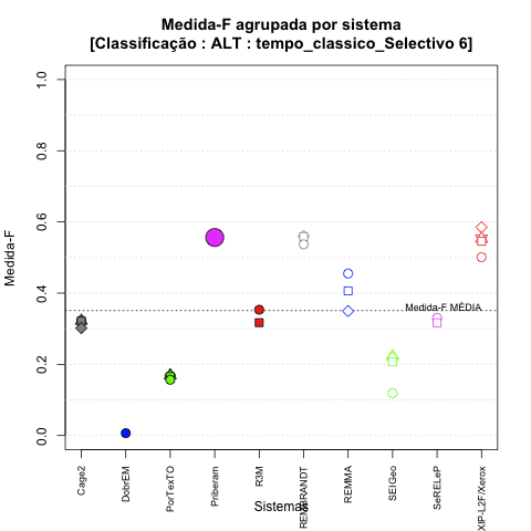- com tamanho maior, no caso de gráficos comparativos precisão/abrangência e também no caso dos gráficos apenas com medida-F;