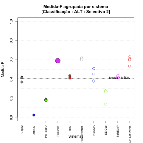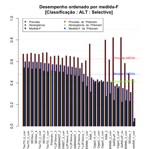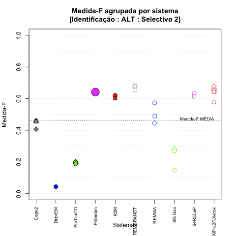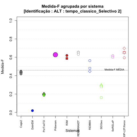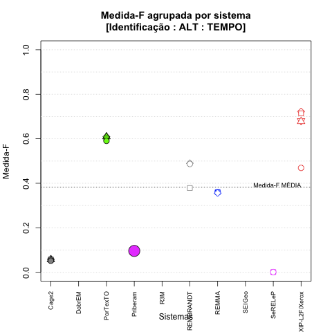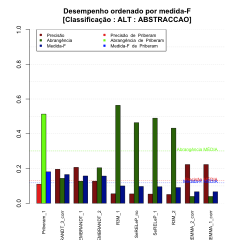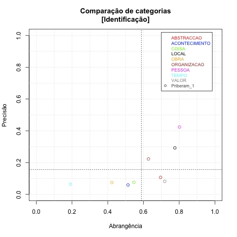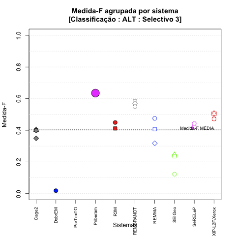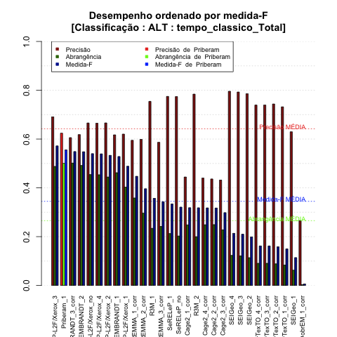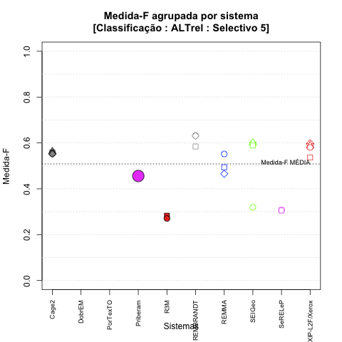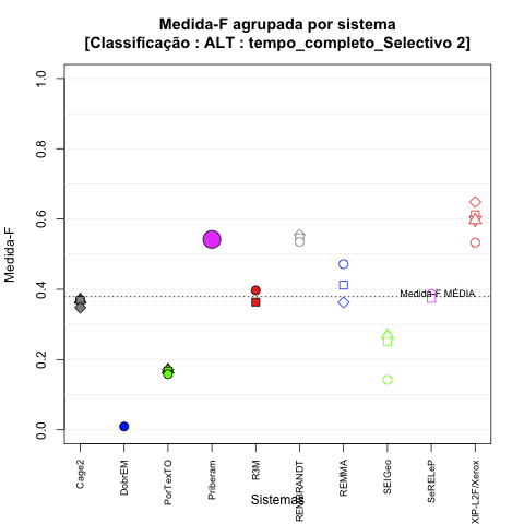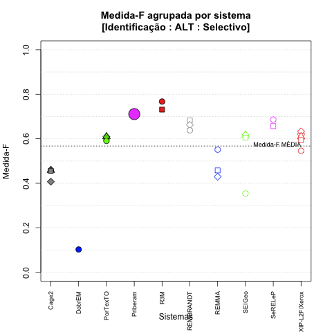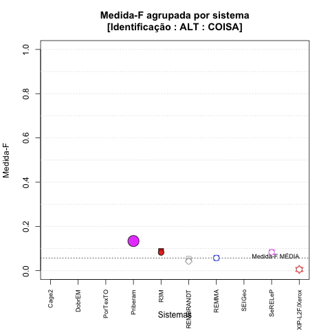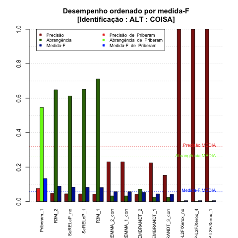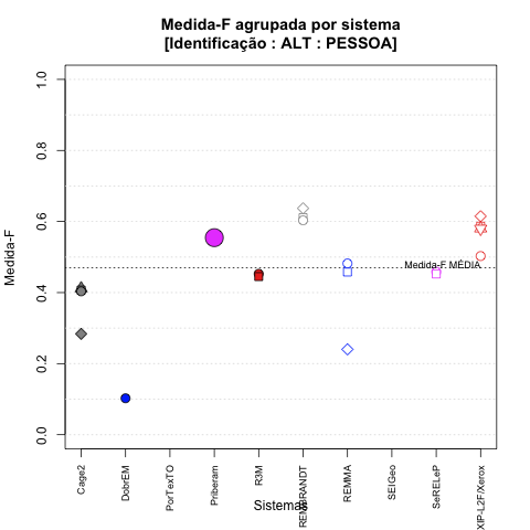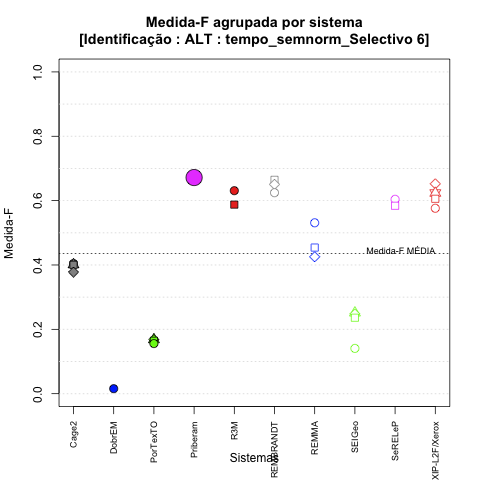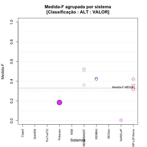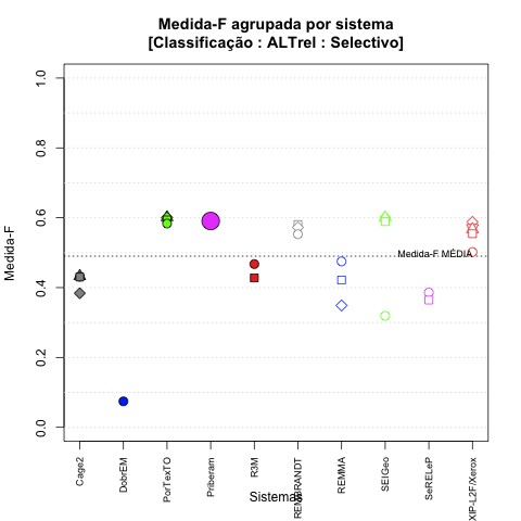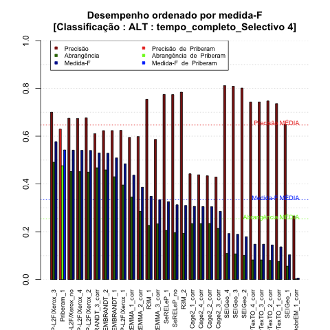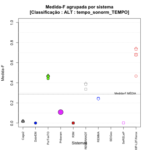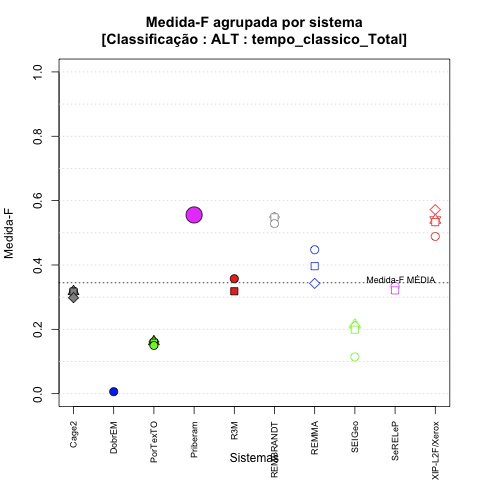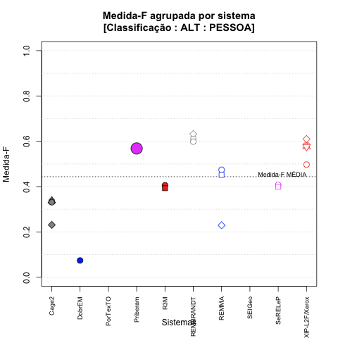 - com tamanho maior, no caso de gráficos comparativos precisão/abrangência e também no caso dos gráficos apenas com medida-F;