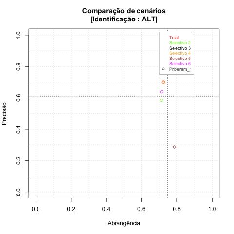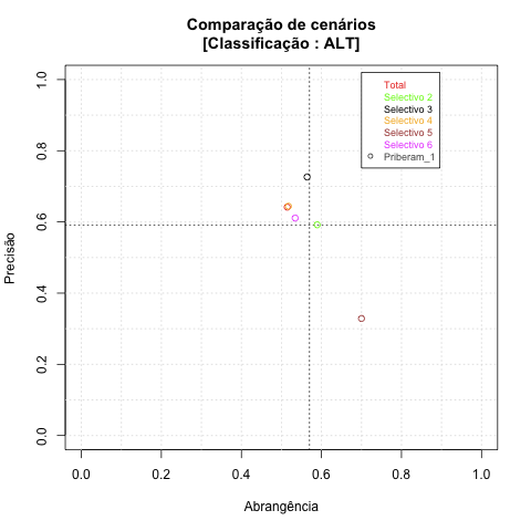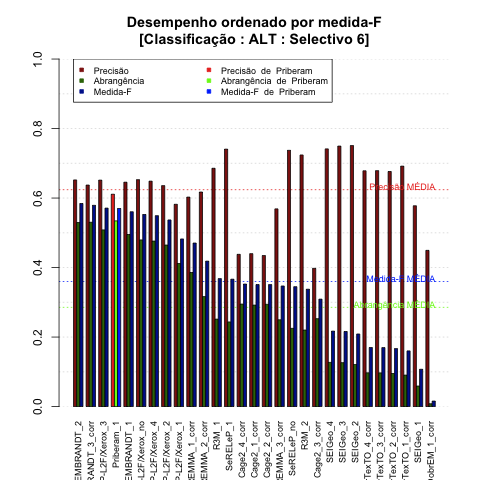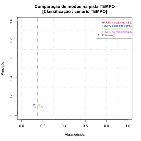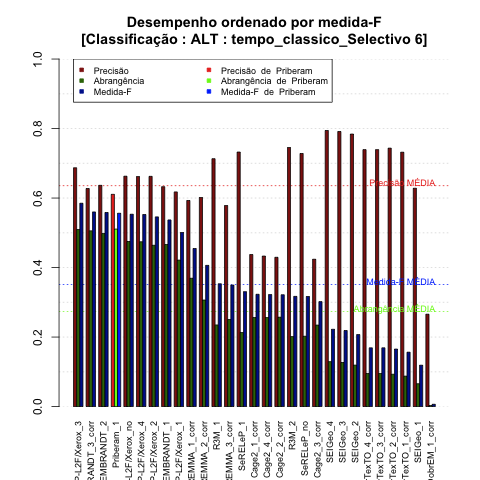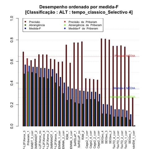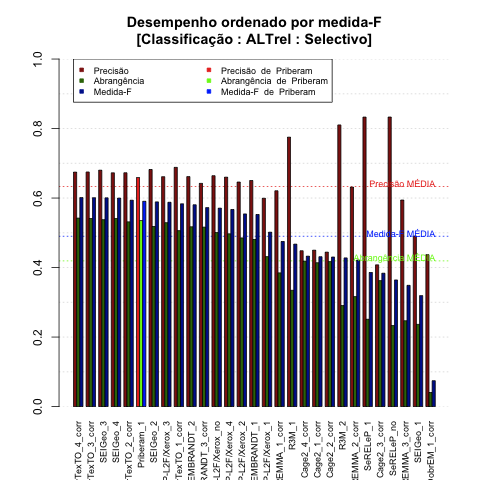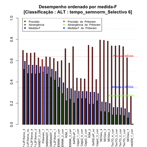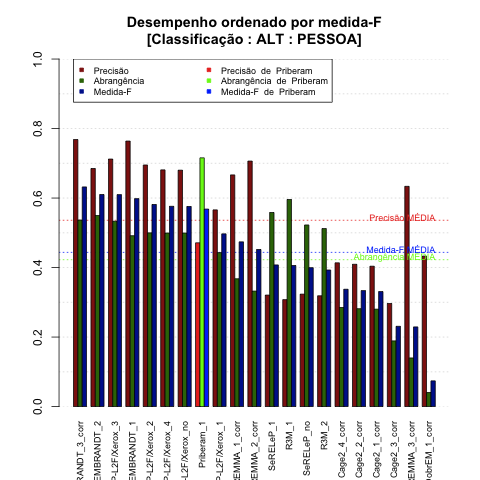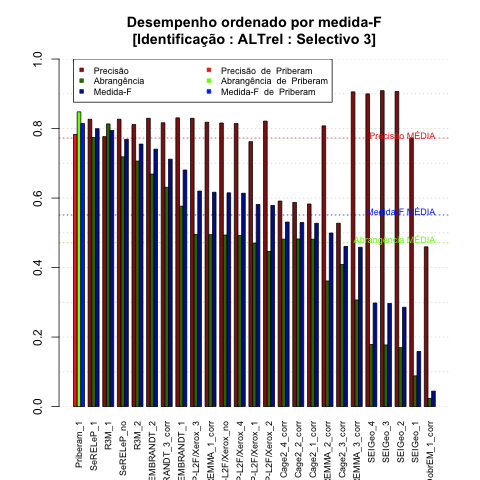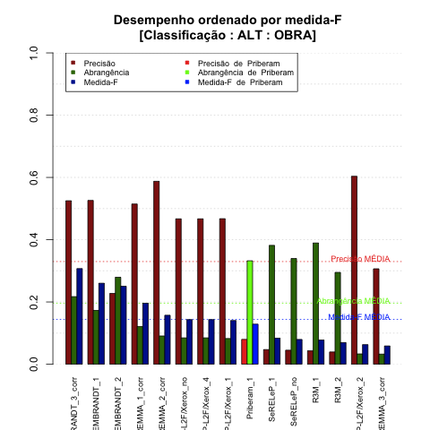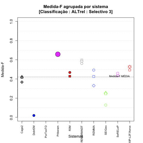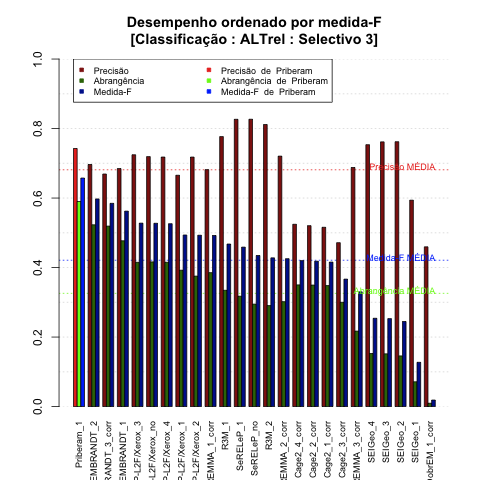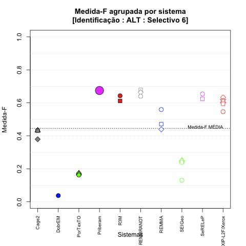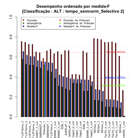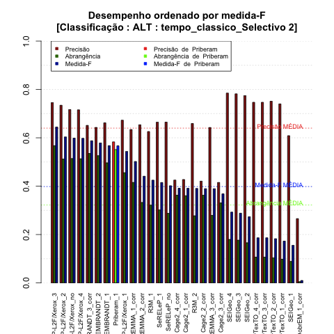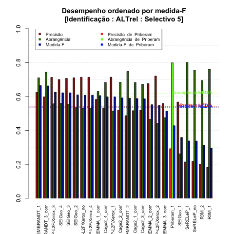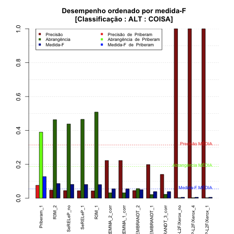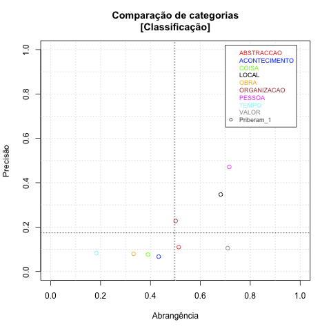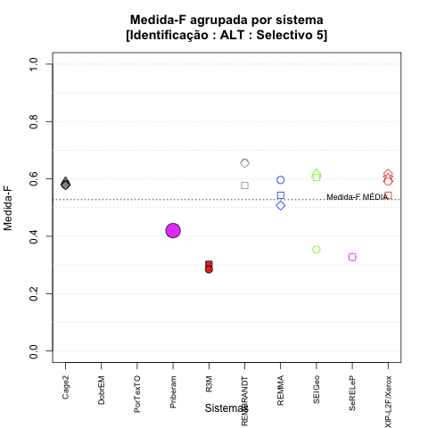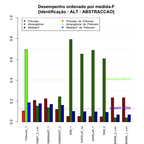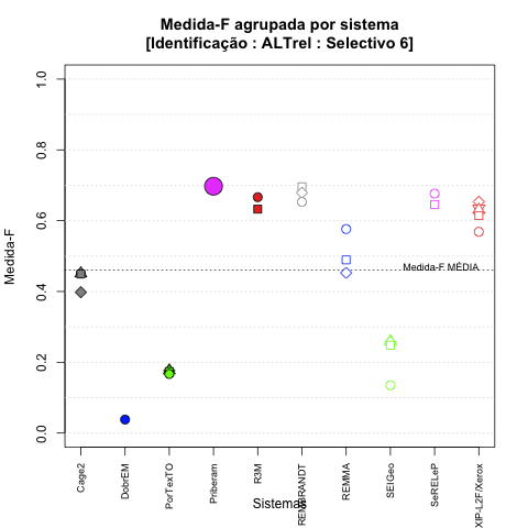 - com tamanho maior, no caso de gráficos comparativos precisão/abrangência e também no caso dos gráficos apenas com medida-F;