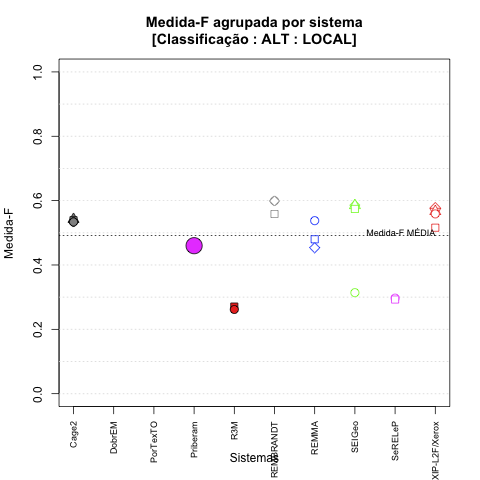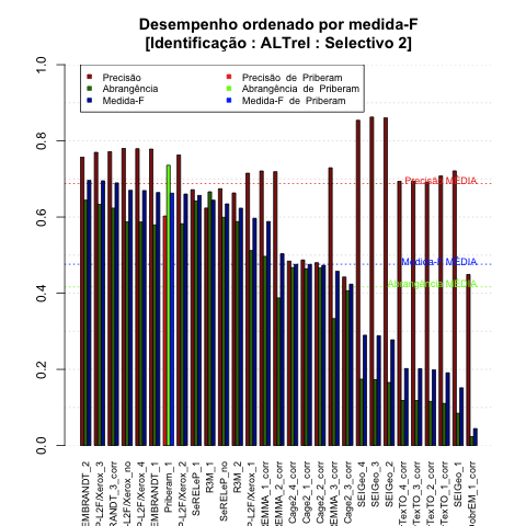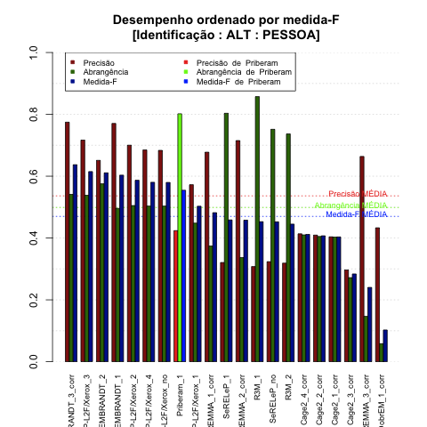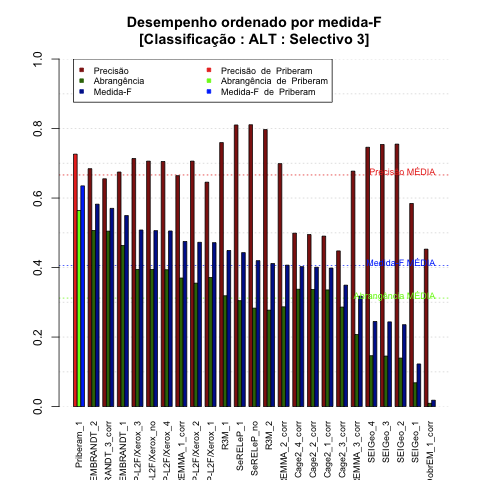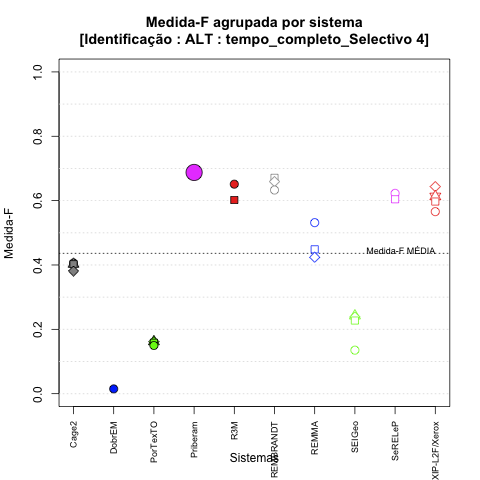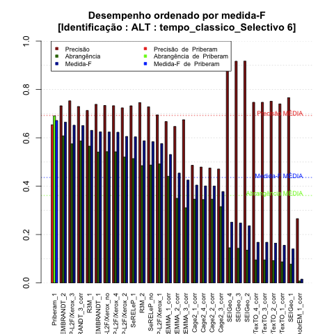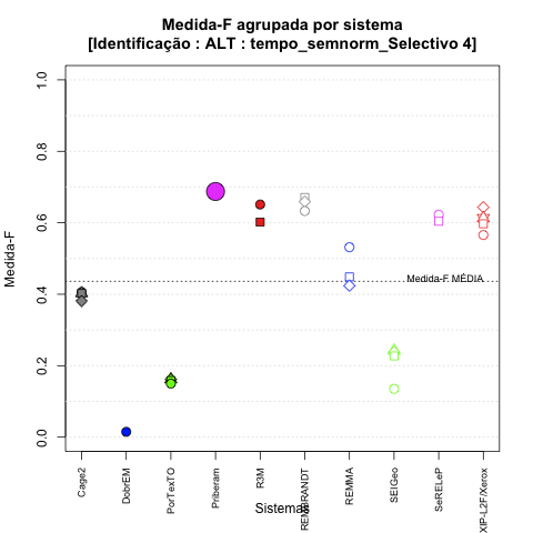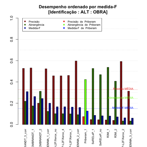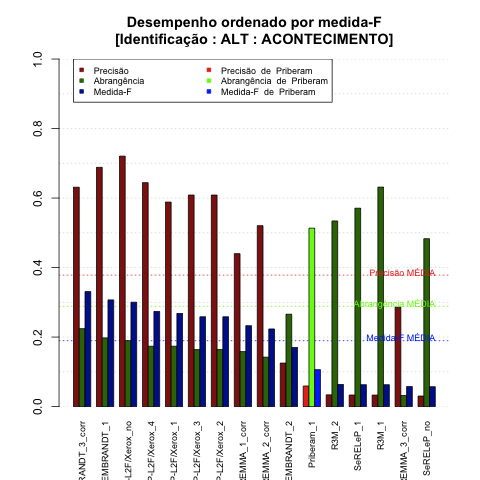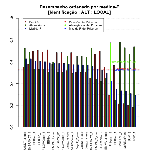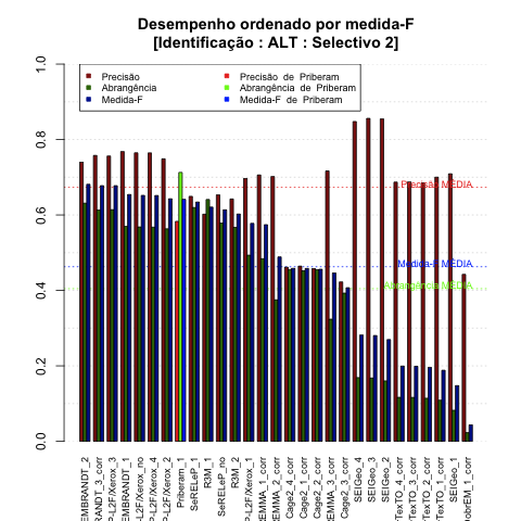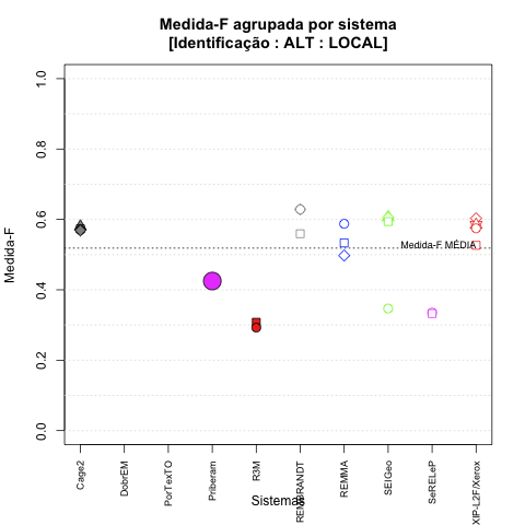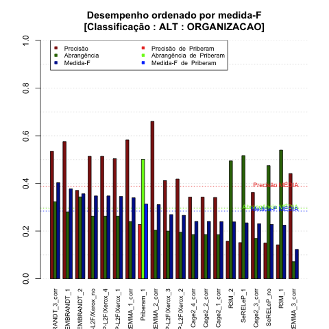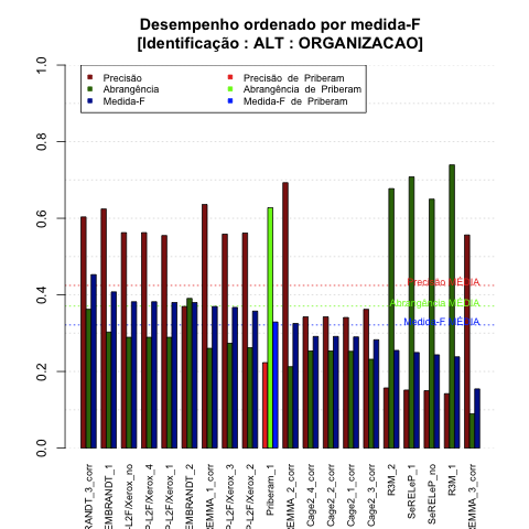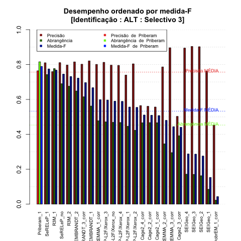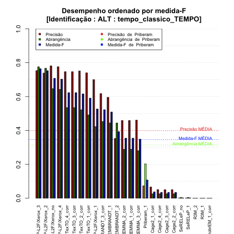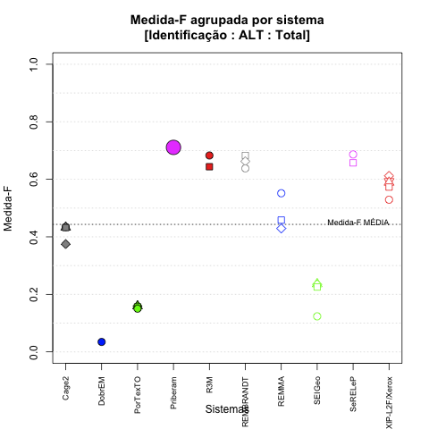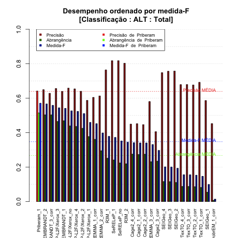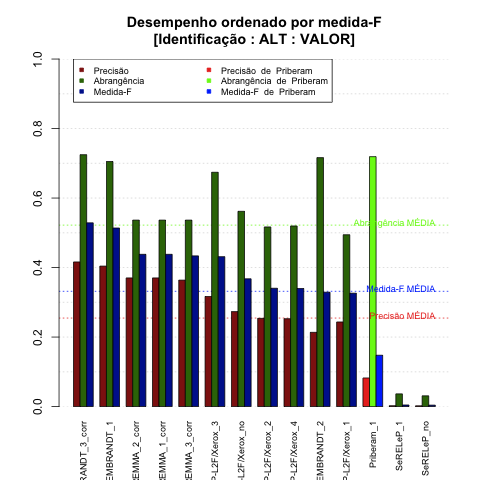 | Saída | Posição (em 14) | Precisão | Abrangência | Medida-F | Sobre-ger | Sub-ger | TotalEMCD | TotalEMSis |