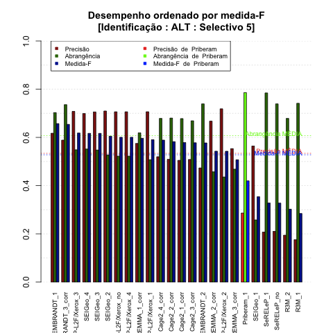 | Saída | Posição (em 15) | Precisão | Abrangência | Medida-F | Sobre-ger | Sub-ger | TotalEMCD | TotalEMSis |