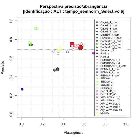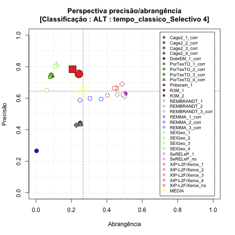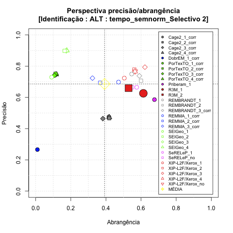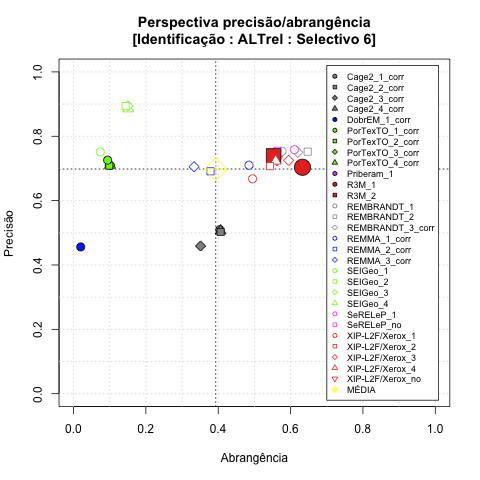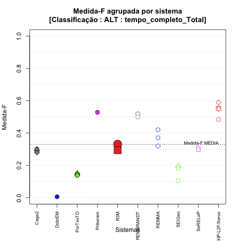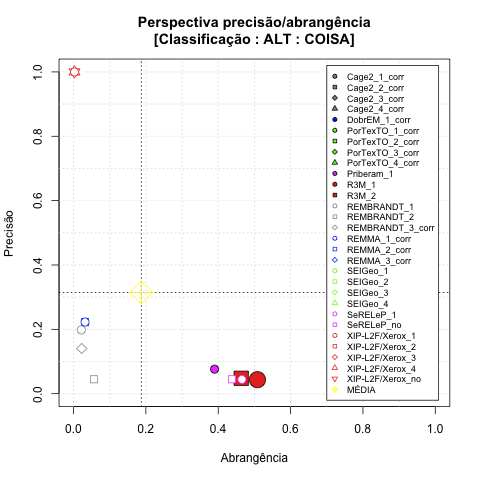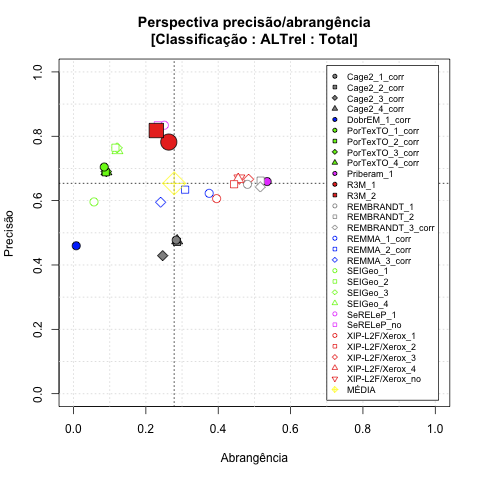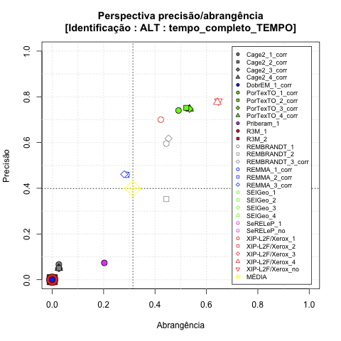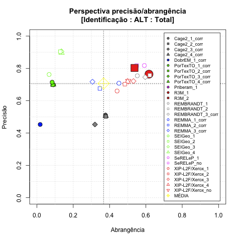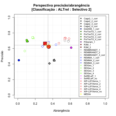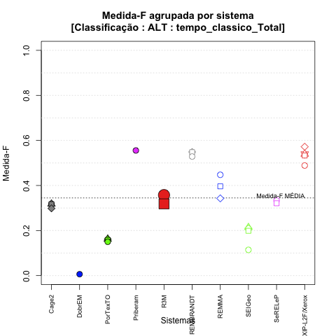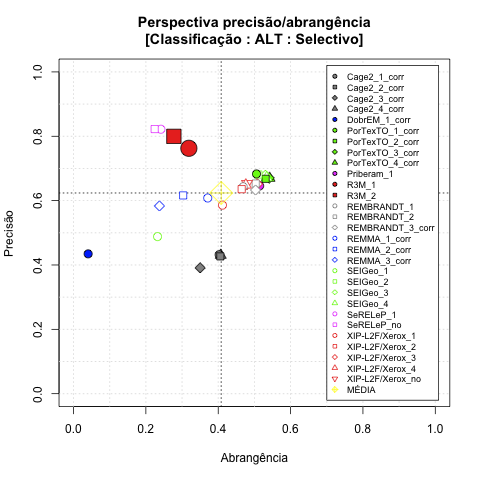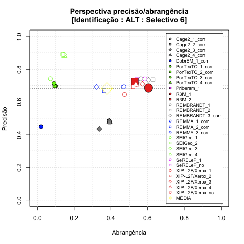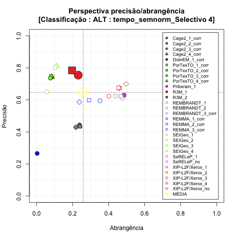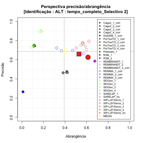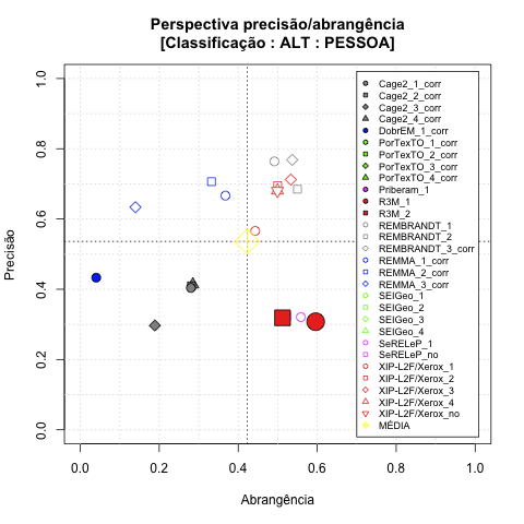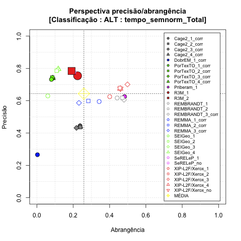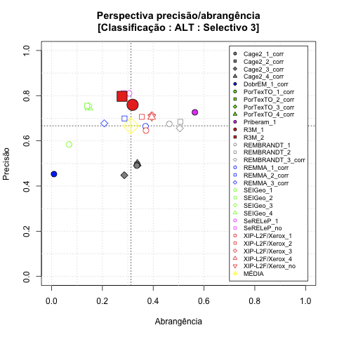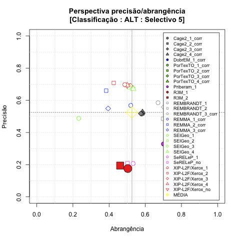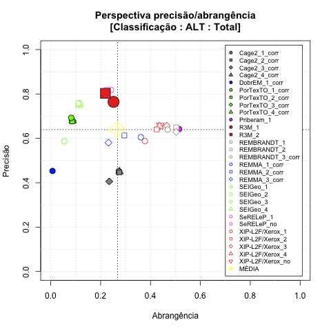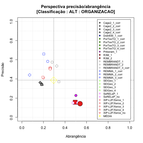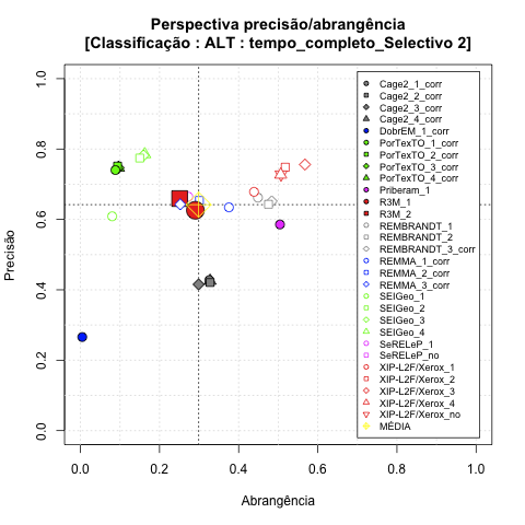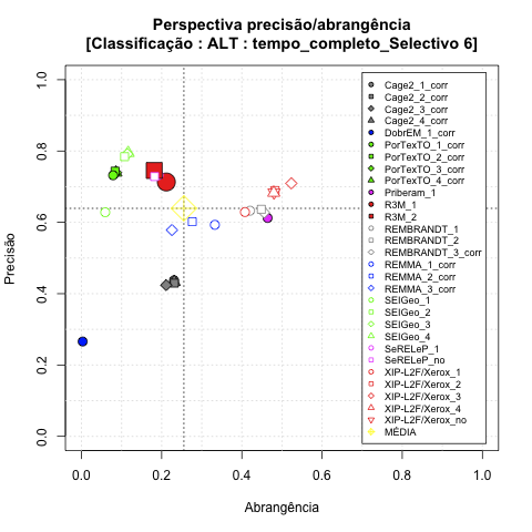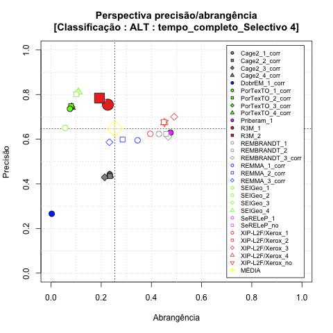 - com tamanho maior, no caso de gráficos comparativos precisão/abrangência e também no caso dos gráficos apenas com medida-F;