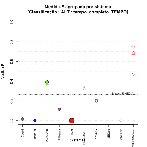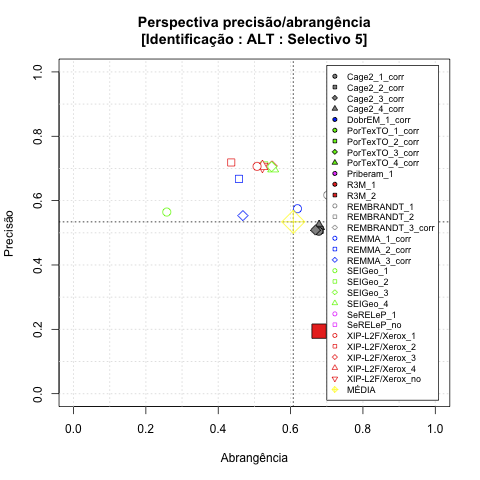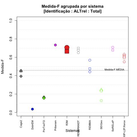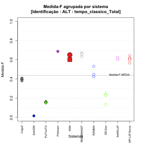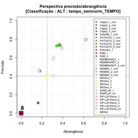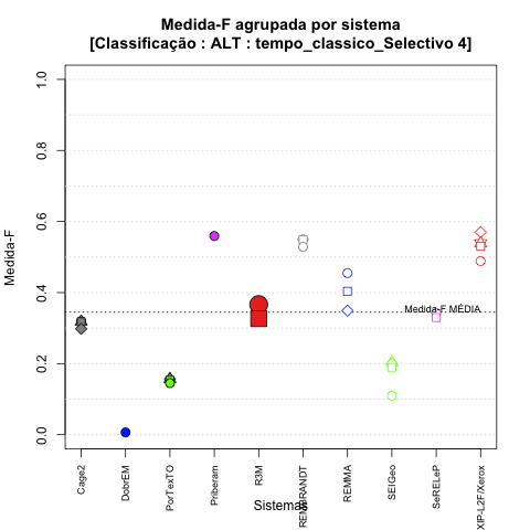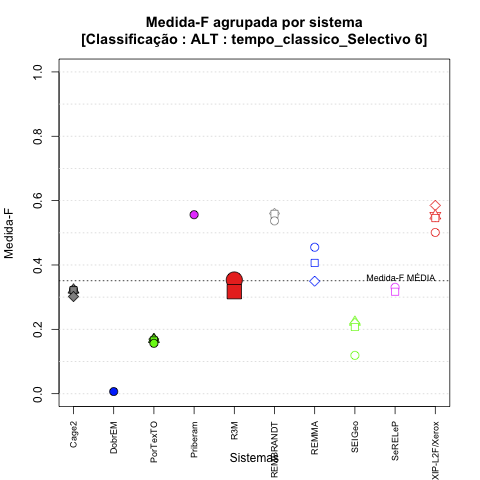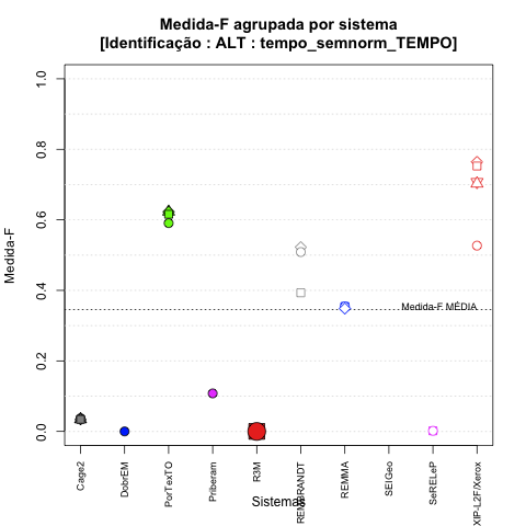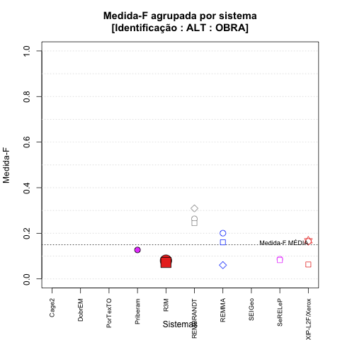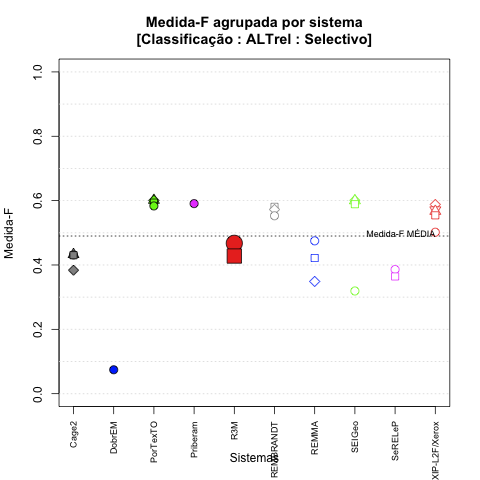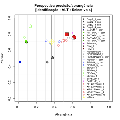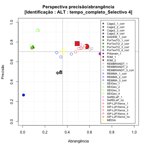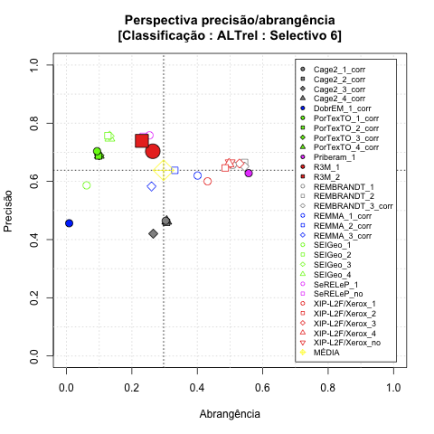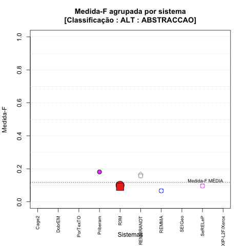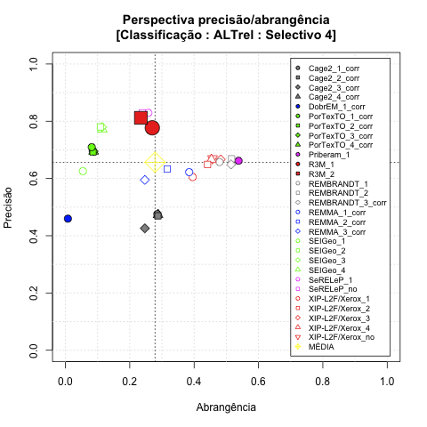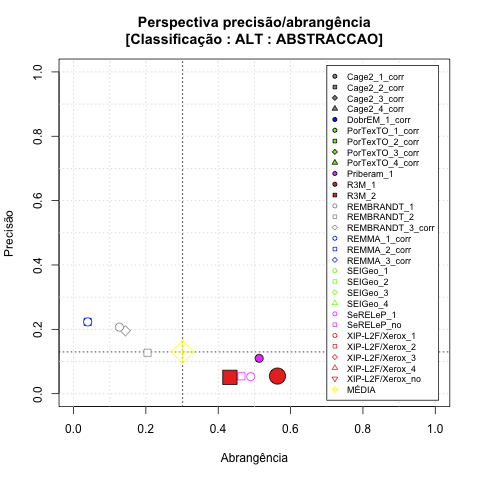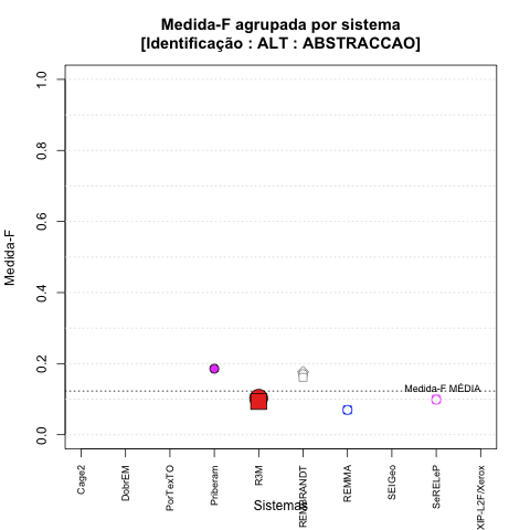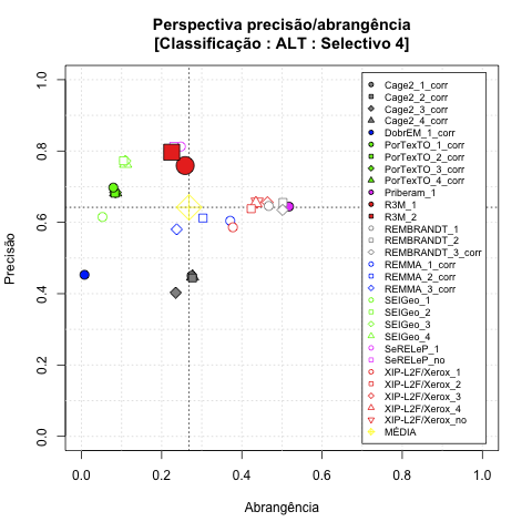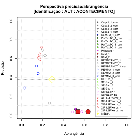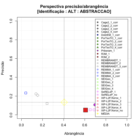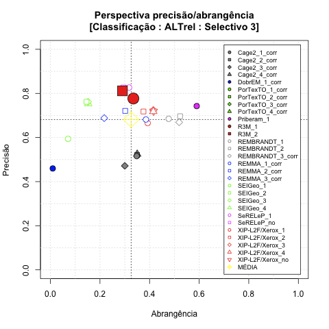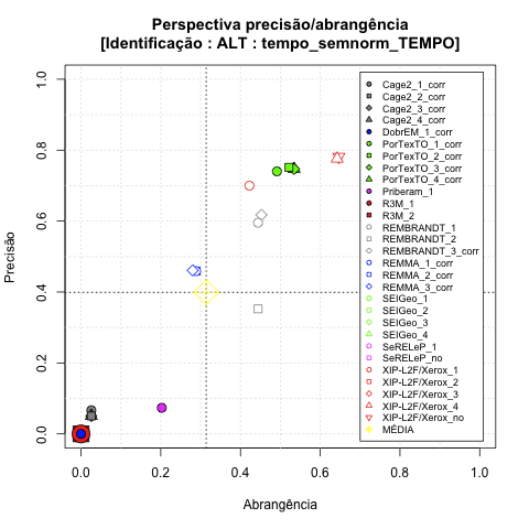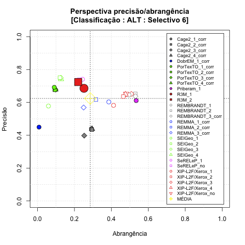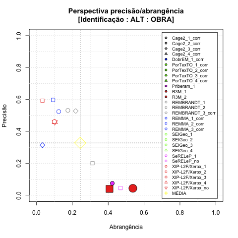 - com tamanho maior, no caso de gráficos comparativos precisão/abrangência e também no caso dos gráficos apenas com medida-F;
