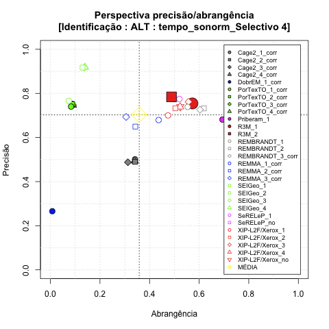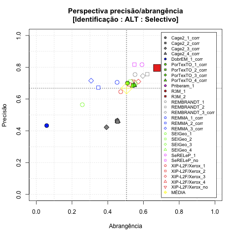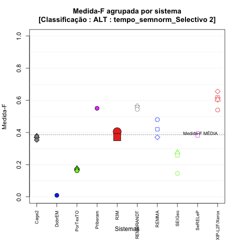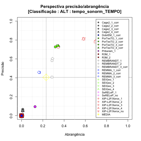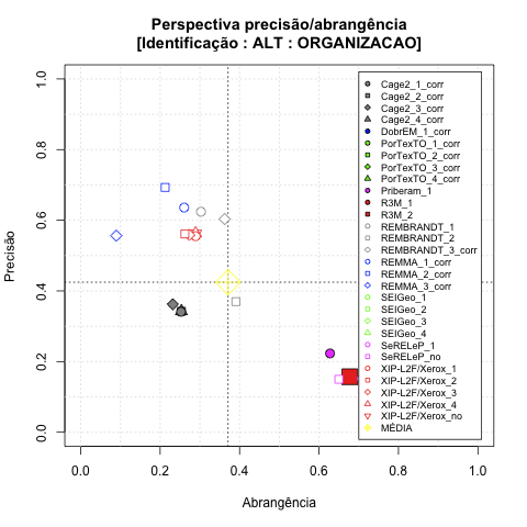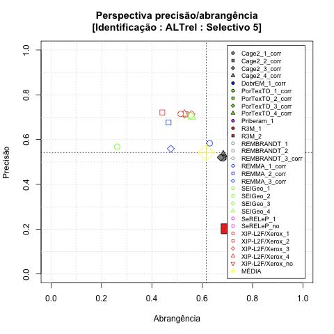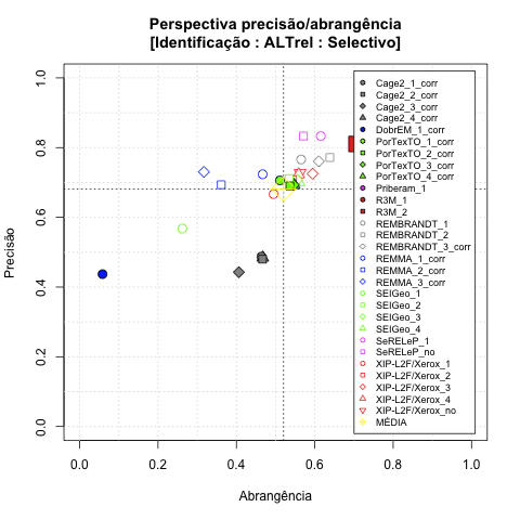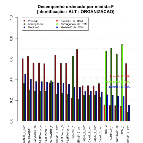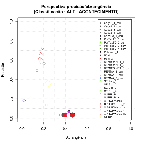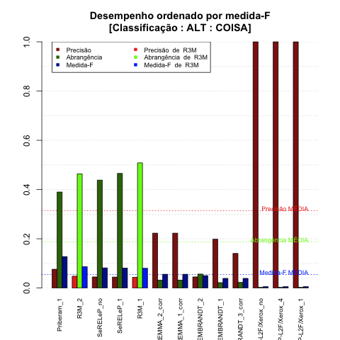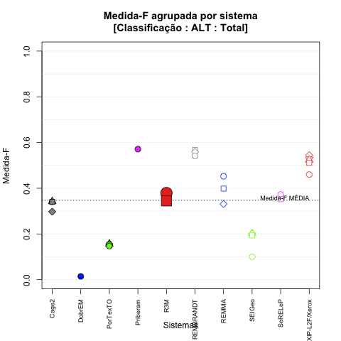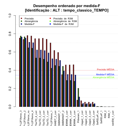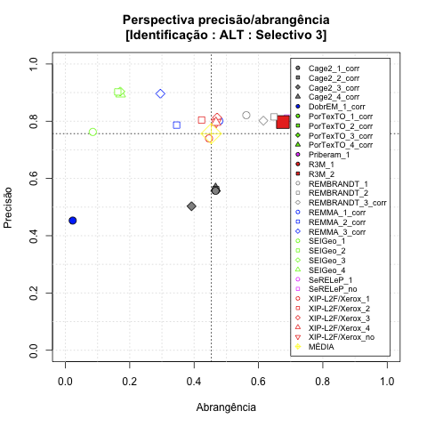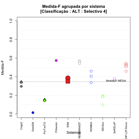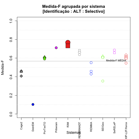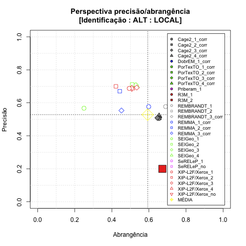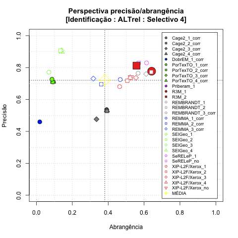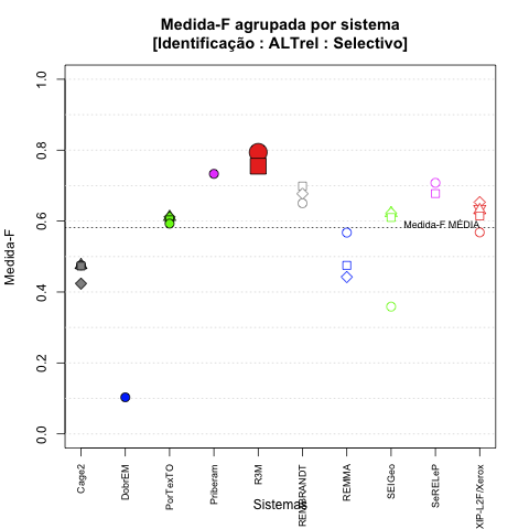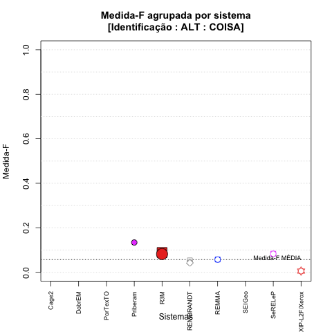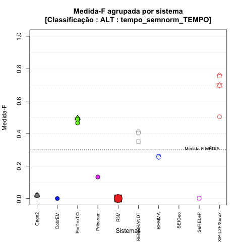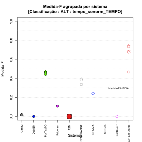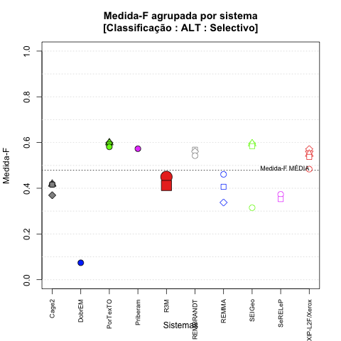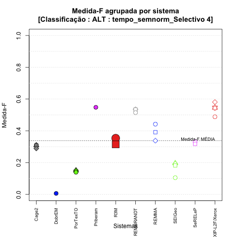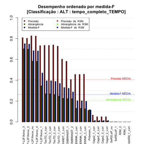 - com tamanho maior, no caso de gráficos comparativos precisão/abrangência e também no caso dos gráficos apenas com medida-F;