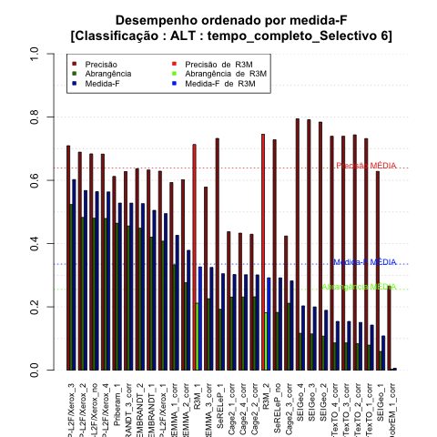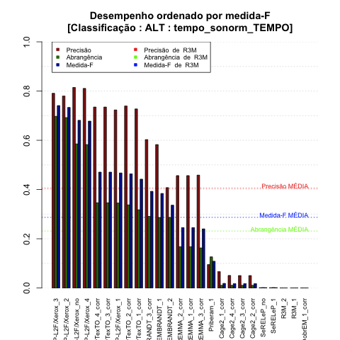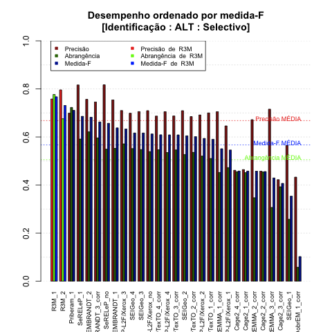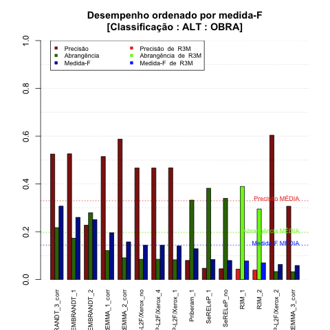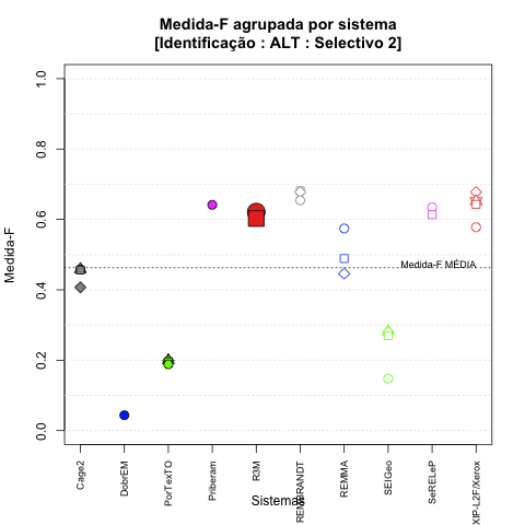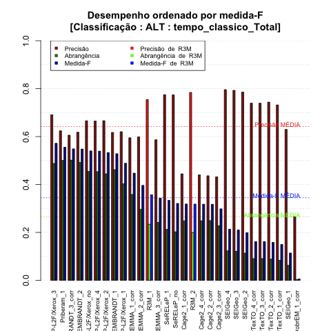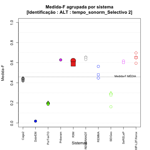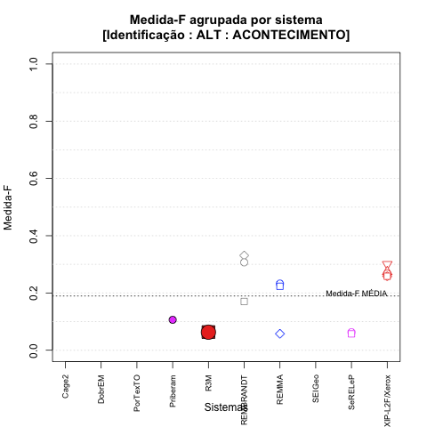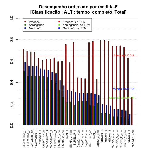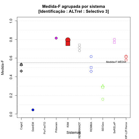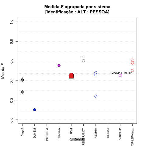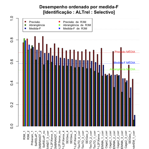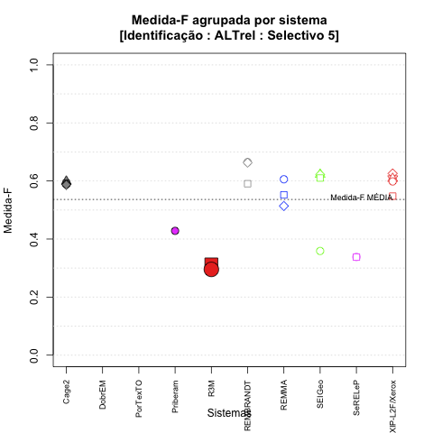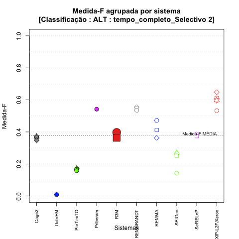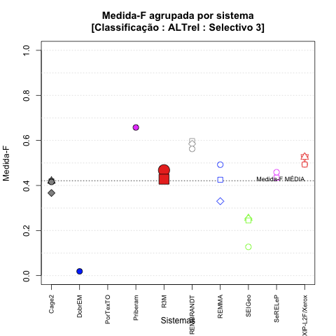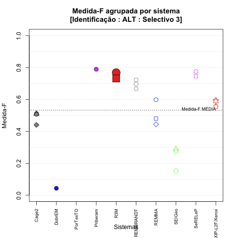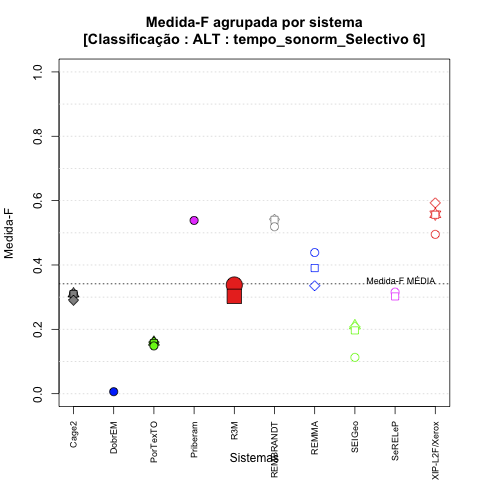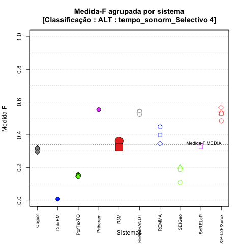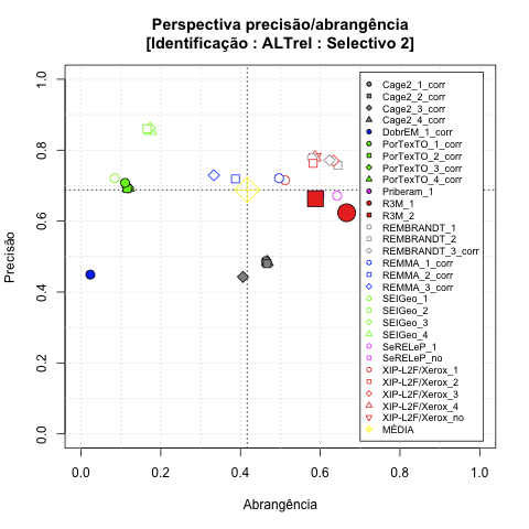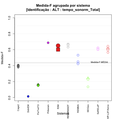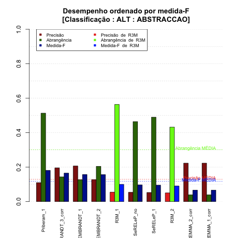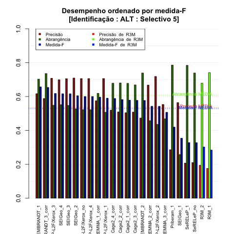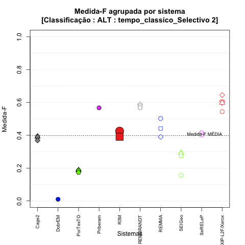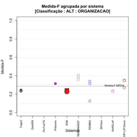 - com tamanho maior, no caso de gráficos comparativos precisão/abrangência e também no caso dos gráficos apenas com medida-F;