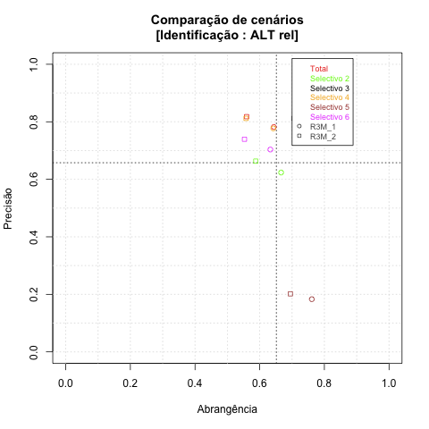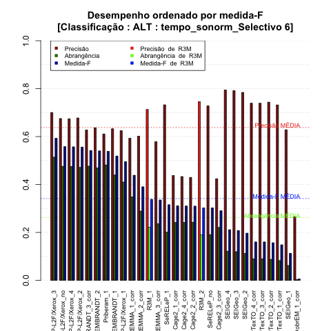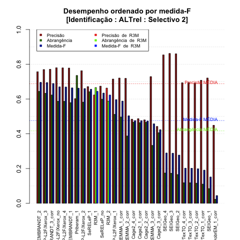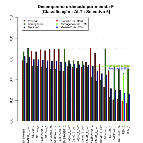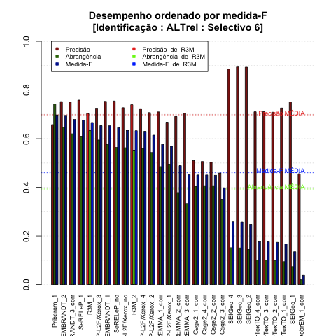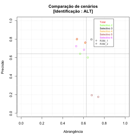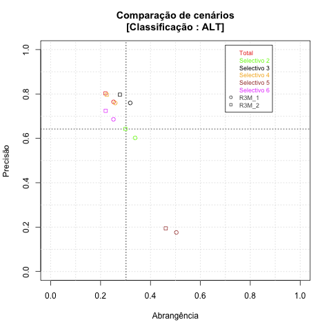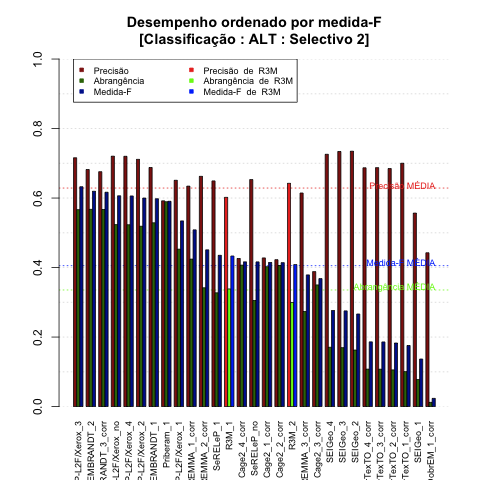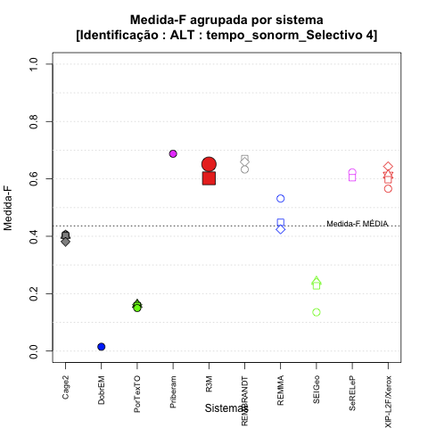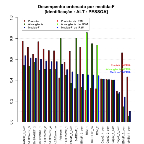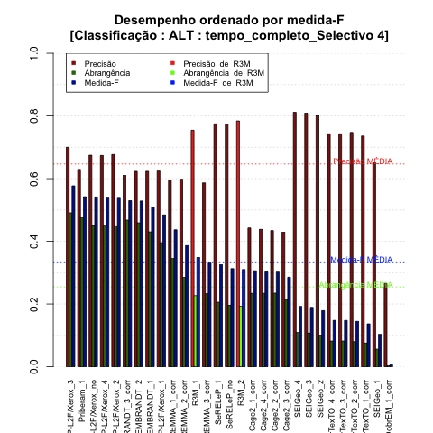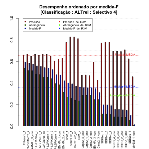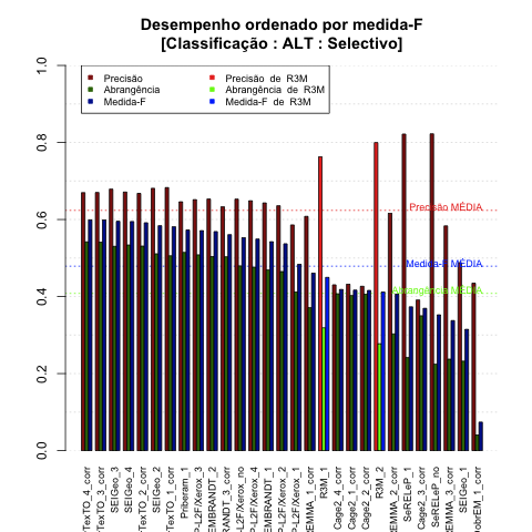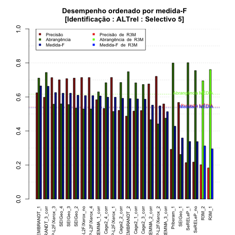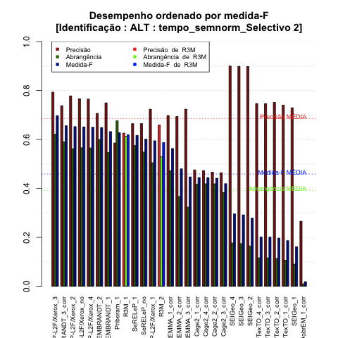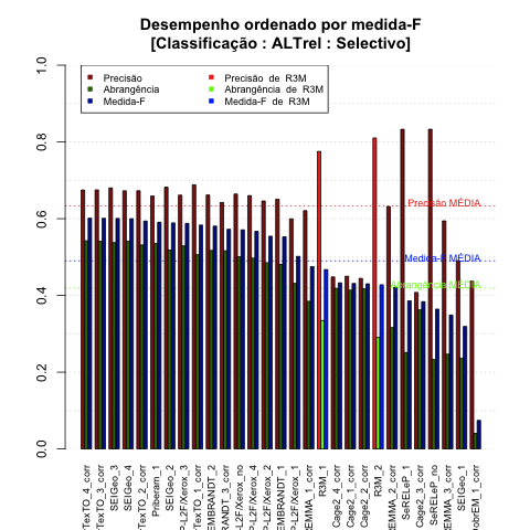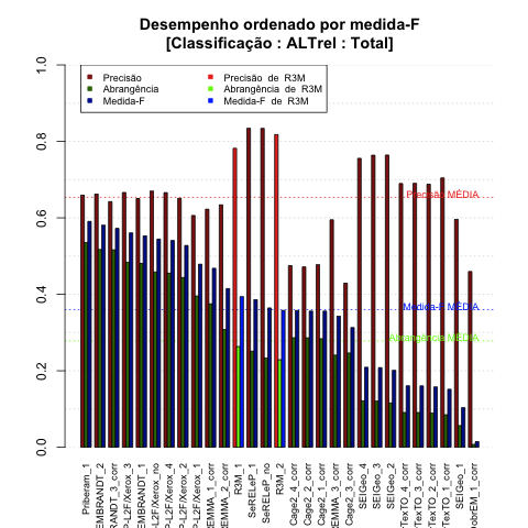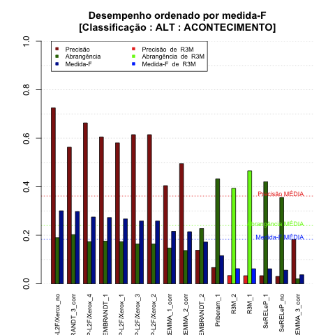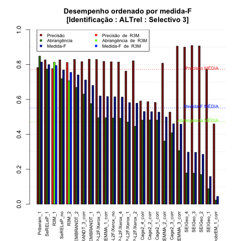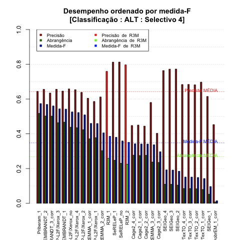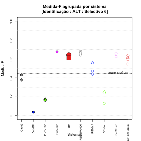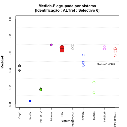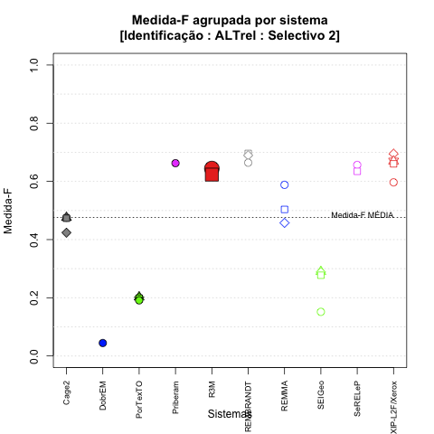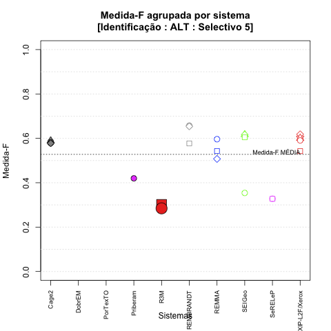 - com tamanho maior, no caso de gráficos comparativos precisão/abrangência e também no caso dos gráficos apenas com medida-F;