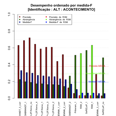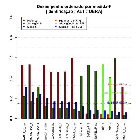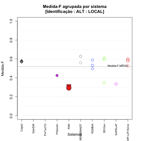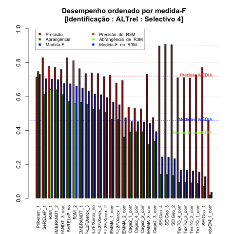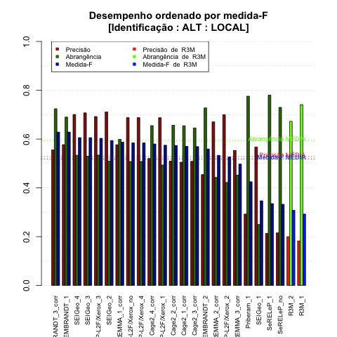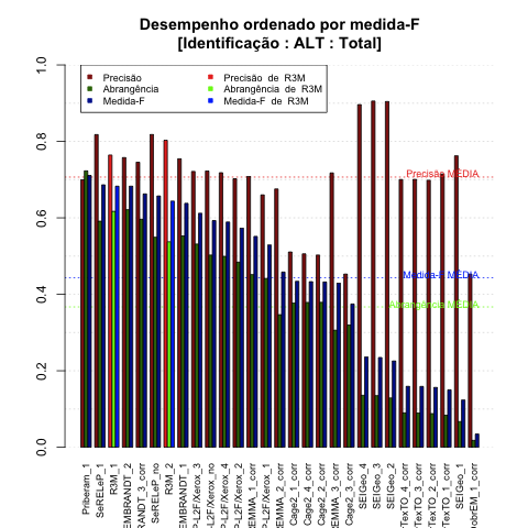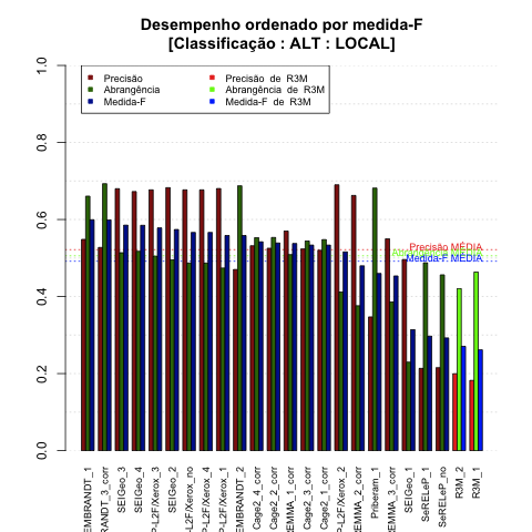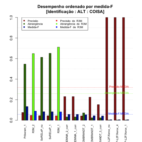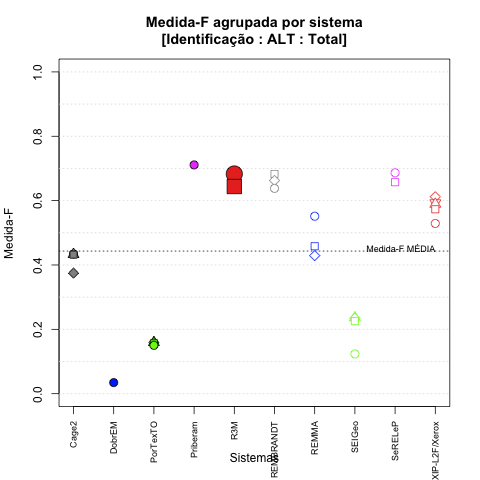 | Saída | Posição (em 29) | Precisão | Abrangência | Medida-F | Sobre-ger | Sub-ger | TotalEMCD | TotalEMSis |