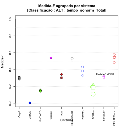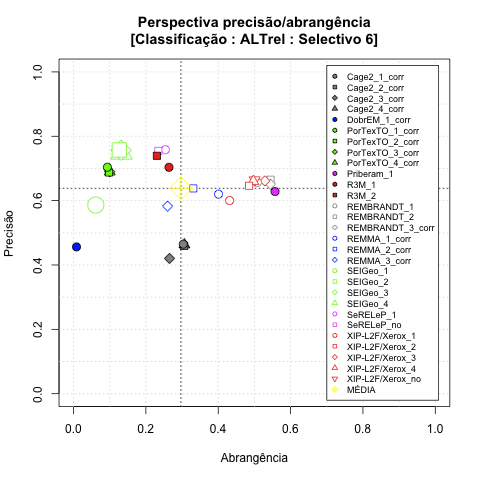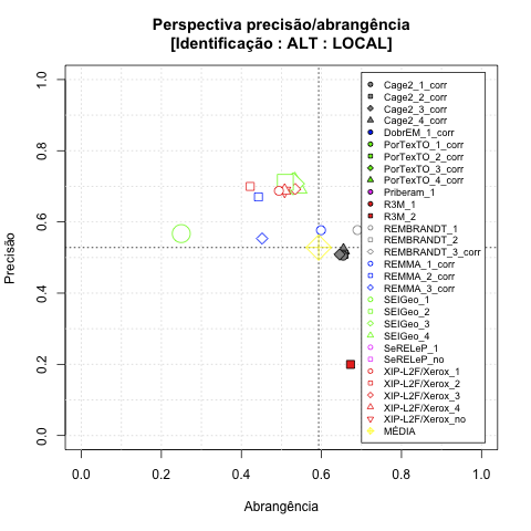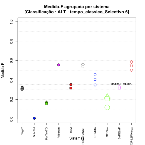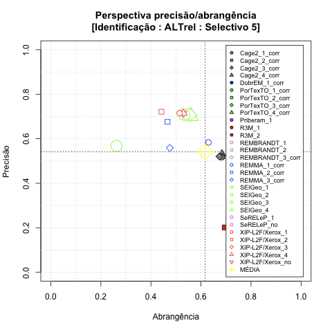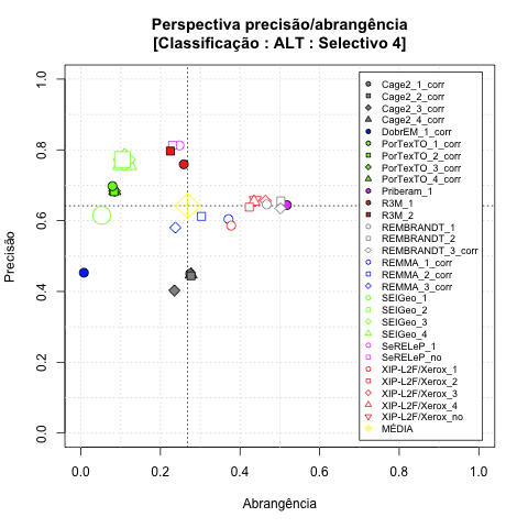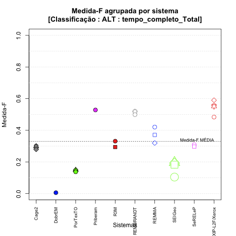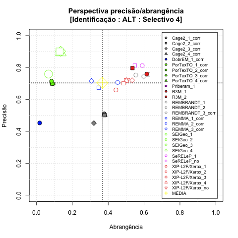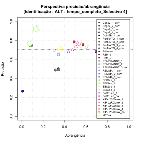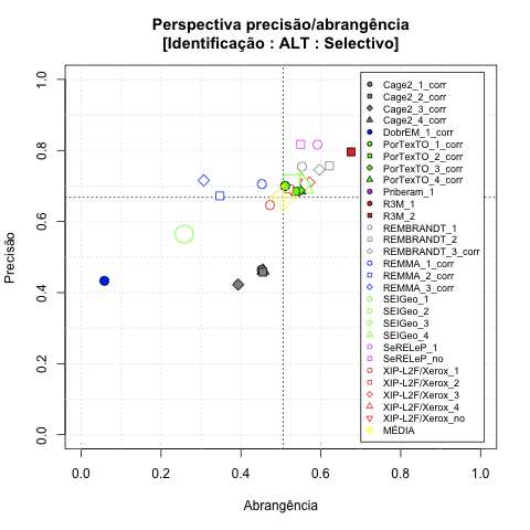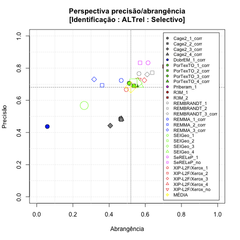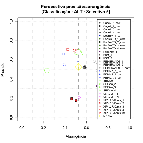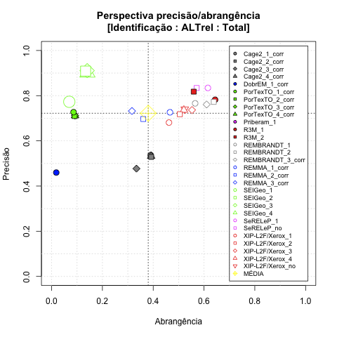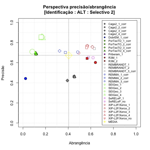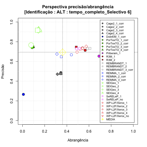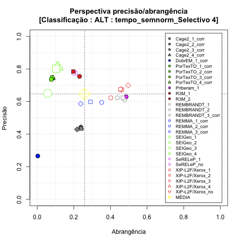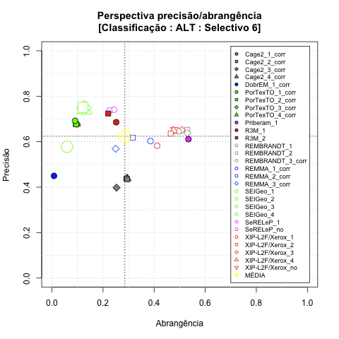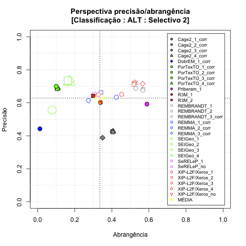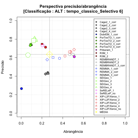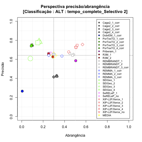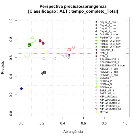 - com tamanho maior, no caso de gráficos comparativos precisão/abrangência e também no caso dos gráficos apenas com medida-F;