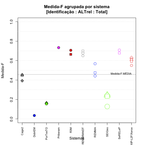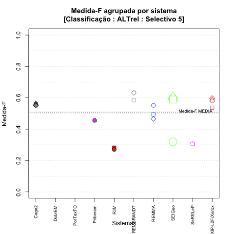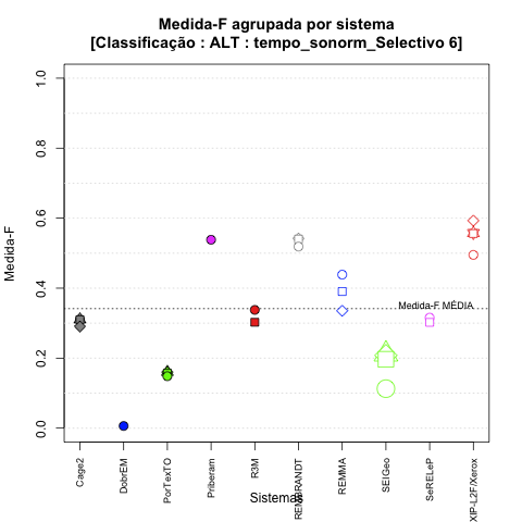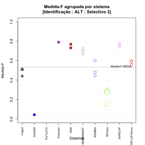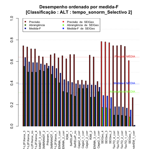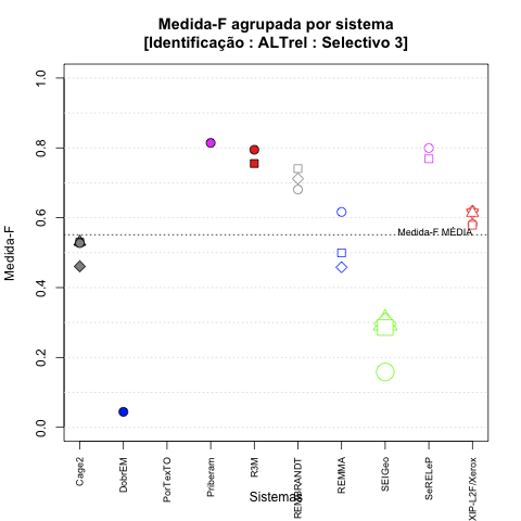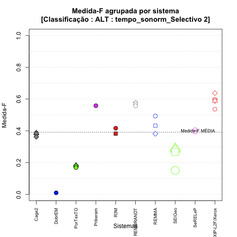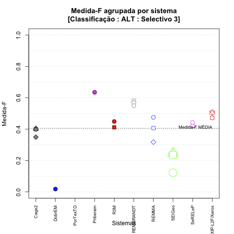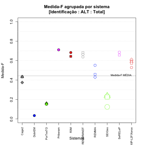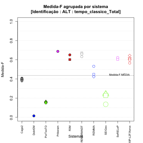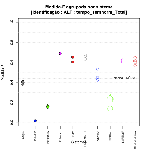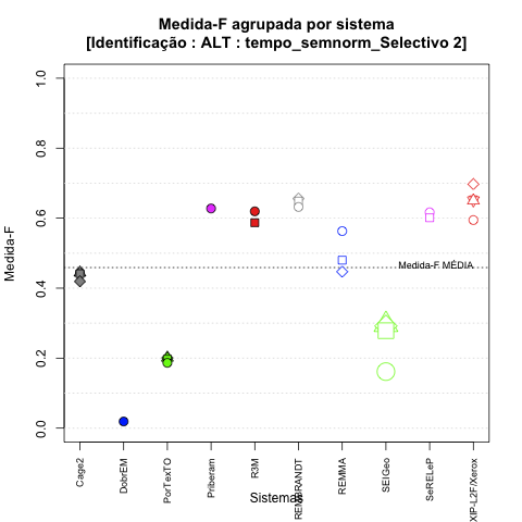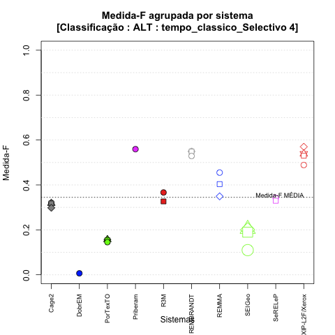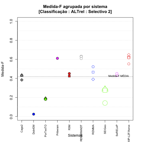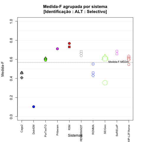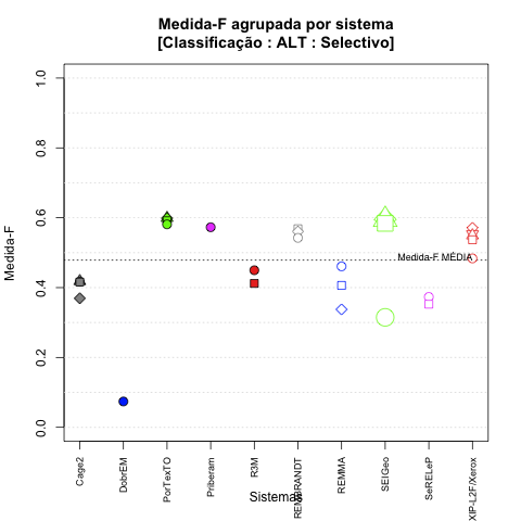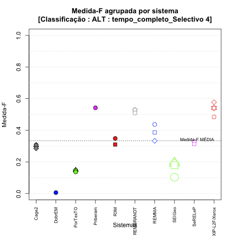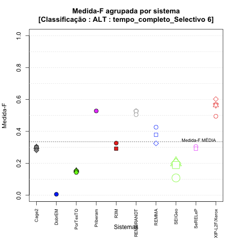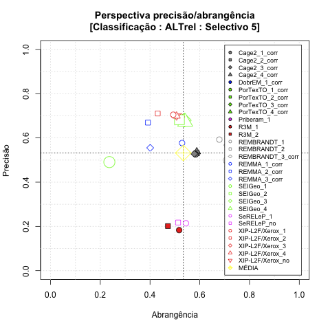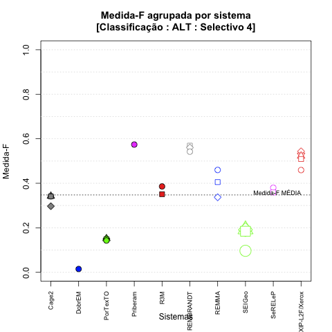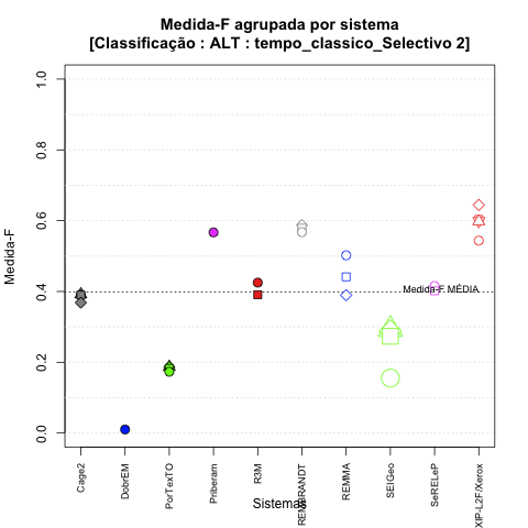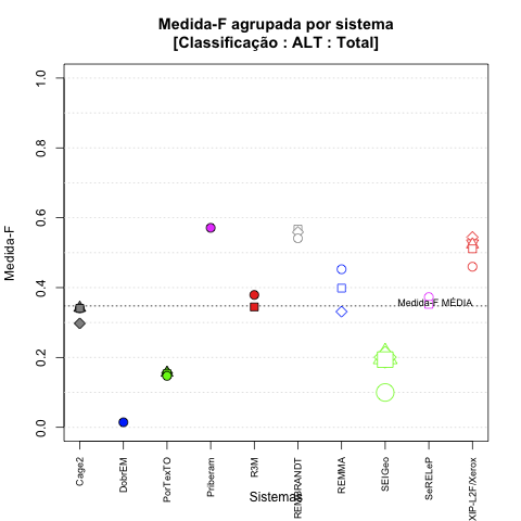 - com tamanho maior, no caso de gráficos comparativos precisão/abrangência e também no caso dos gráficos apenas com medida-F;