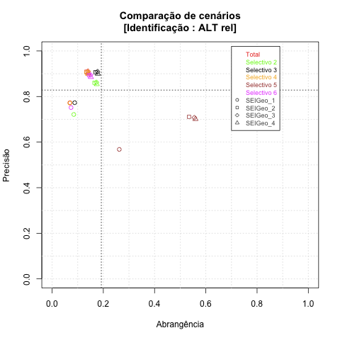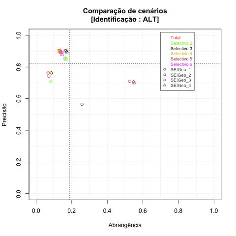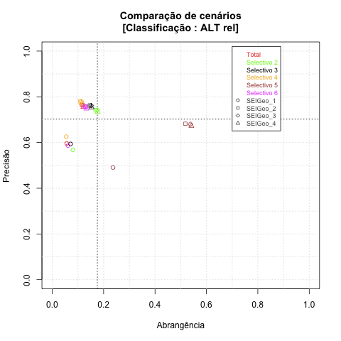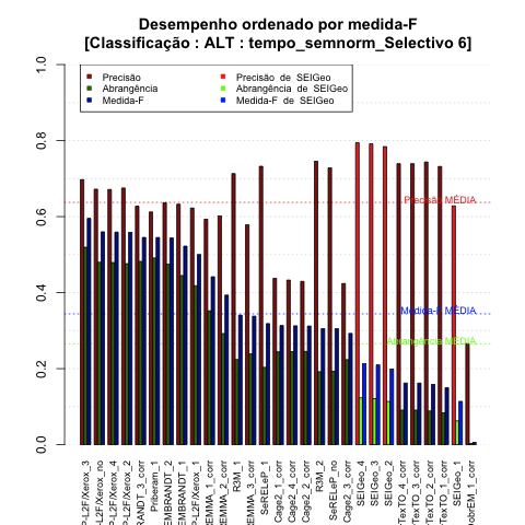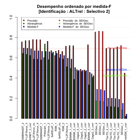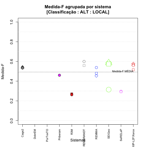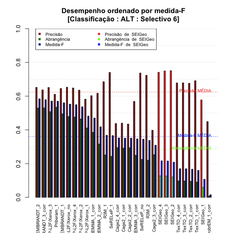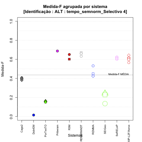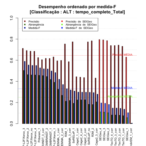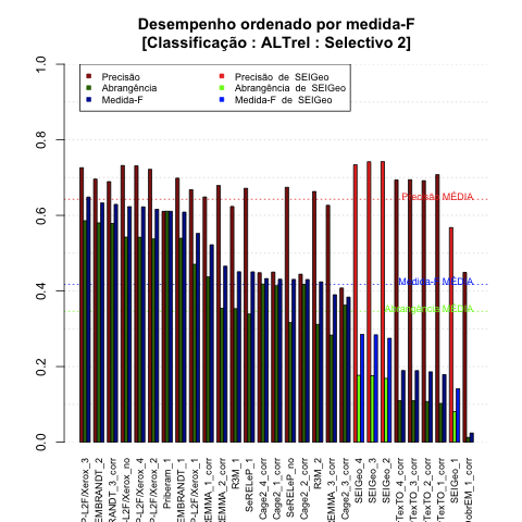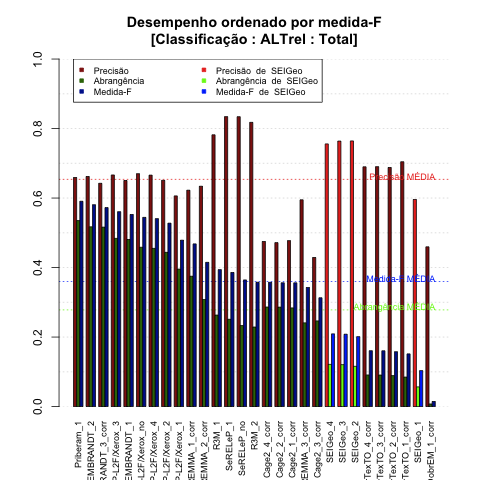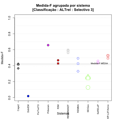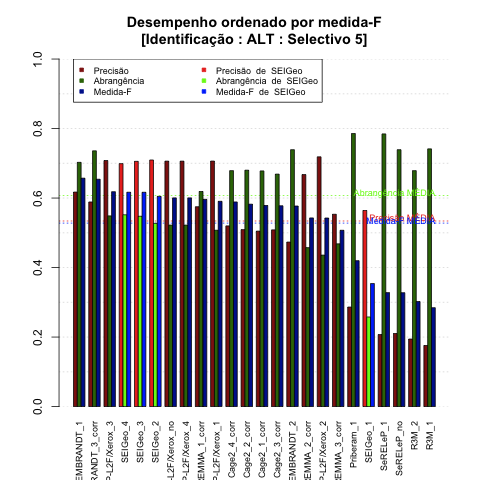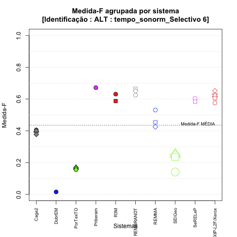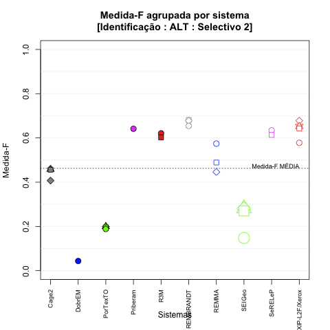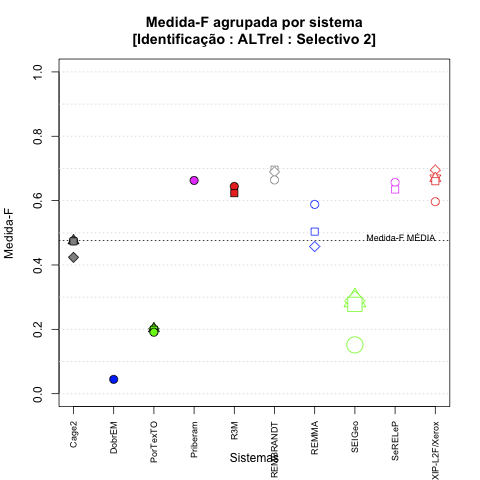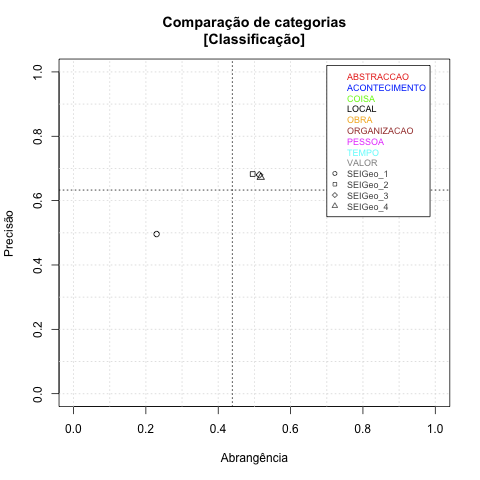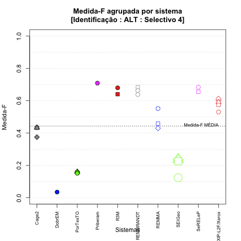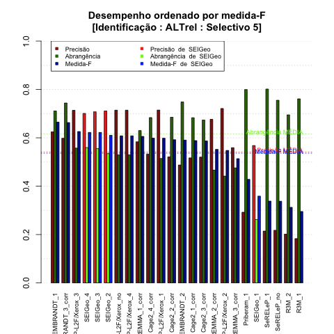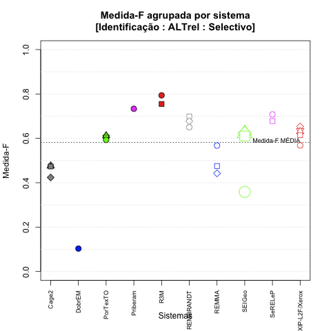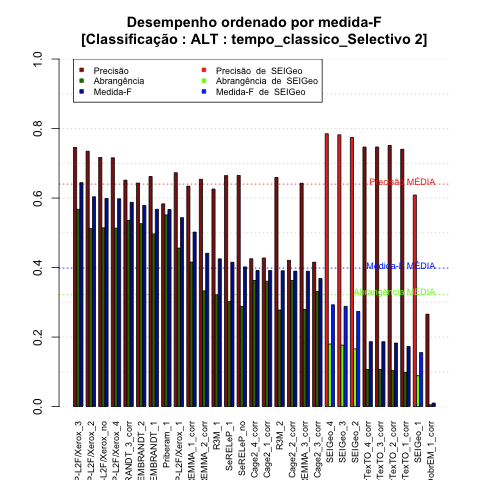 - com tamanho maior, no caso de gráficos comparativos precisão/abrangência e também no caso dos gráficos apenas com medida-F;