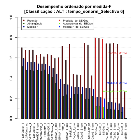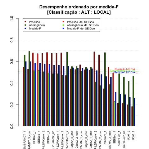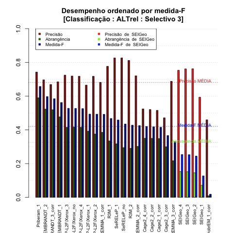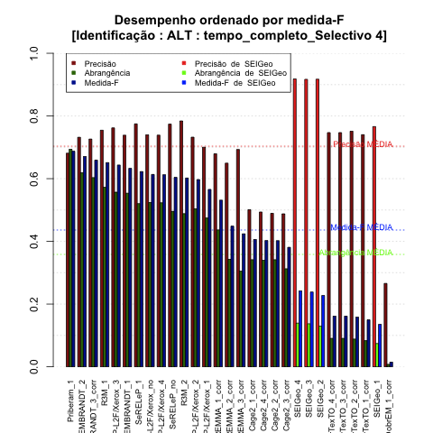 | Saída | Posição (em 25) | Precisão | Abrangência | Medida-F | Sobre-ger | Sub-ger | TotalEMCD | TotalEMSis |