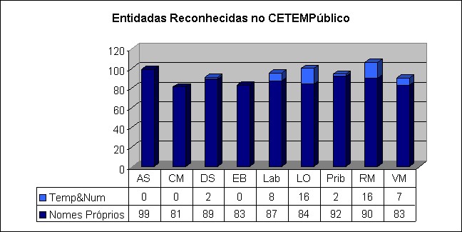 PESSOA (HUM, BRAND/OBJECT) 23 (21, 2) ORGANIZAÇÃO (MEDIA, ORG) 13 (2, 11) LUGAR (CIV, INST, TOP) 34 (23, 8, 3) OUTRO (EVENT, GENRE, HUM, SEM/TIT) 13 (1, 1, 1, 10) Total 83