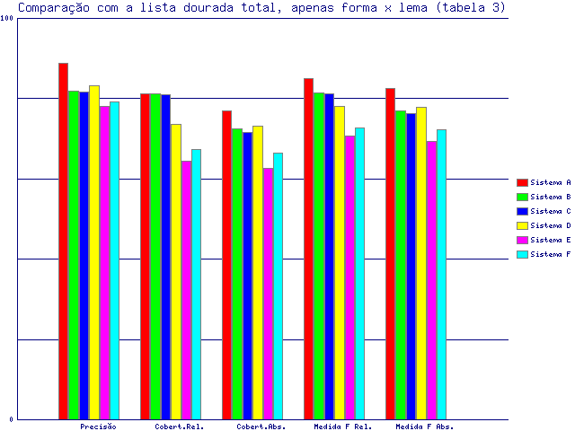 | Tabela 3: Comparação com a lista dourada total, apenas forma x lema | ||||||||||||