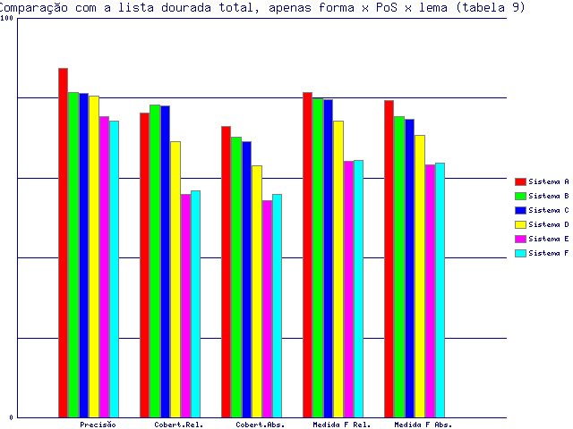 | Tabela 9: Comparação com a lista dourada total, apenas forma x PoS x lema | ||||||||||||