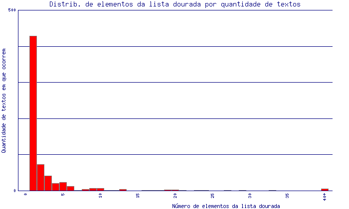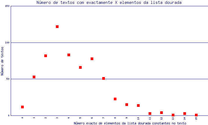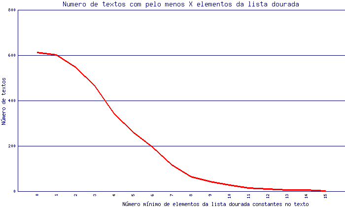 Finalmente os mesmos dados são apresentados de forma acumulada na figura seguinte, que representa o número de textos com pelo menos X elementos da lista dourada.