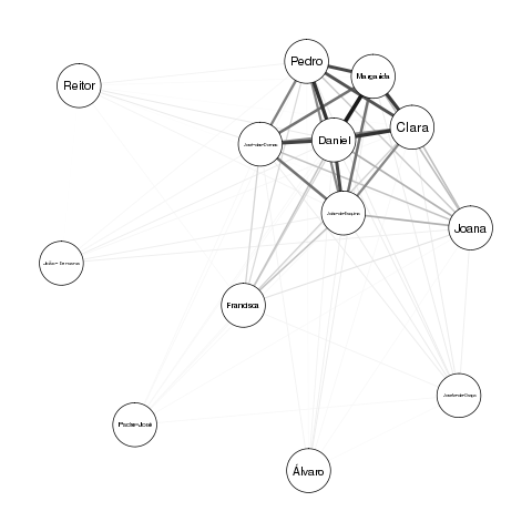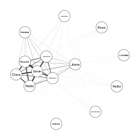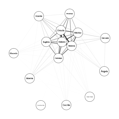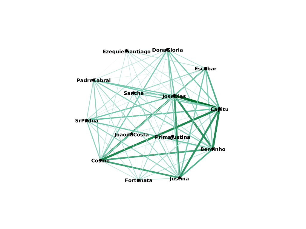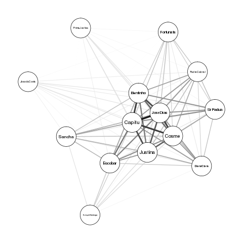 E uma primeira versão de uma rede de personagens, em dois formatos, calculados respetivamente com o módulo qgraph no R, e com o programa Gephi 0.9.2: