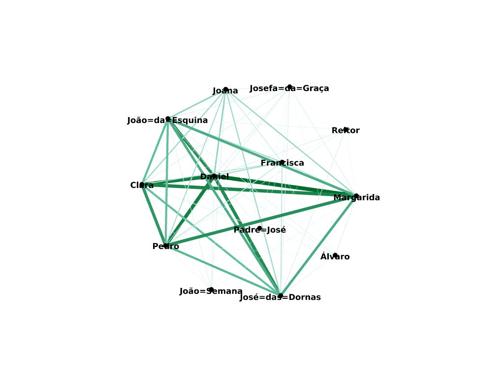 As redes foram obtidas da seguinte maneira: correspondem a quantas vezes duas personagens coocorrrem (em quantos "volumes" de 3000 palavras os nomes de ambas são usados).