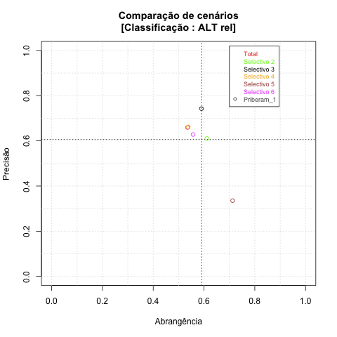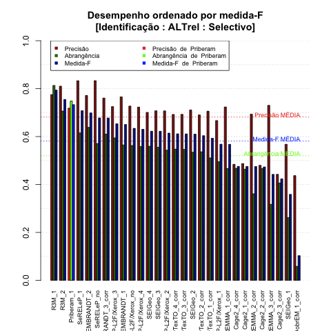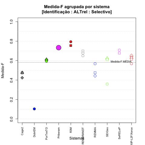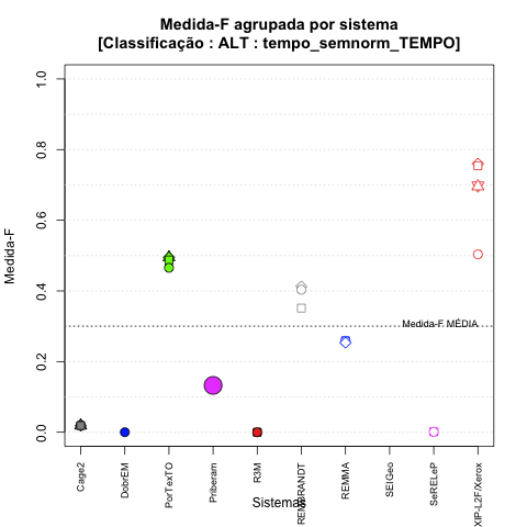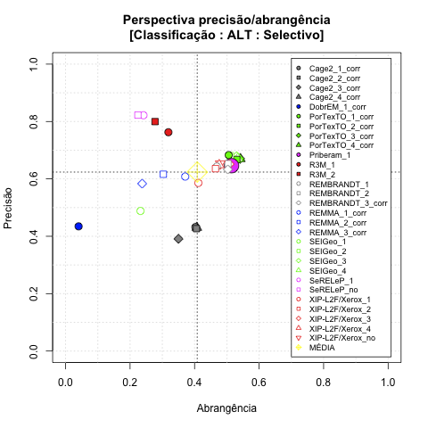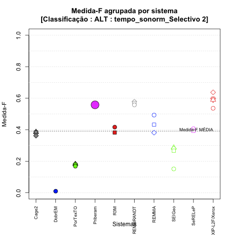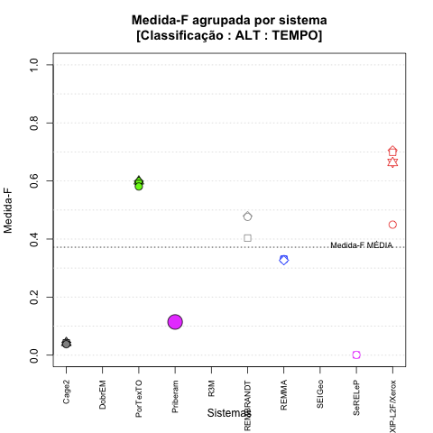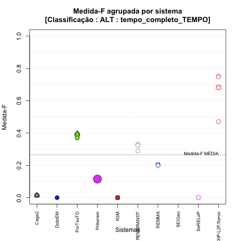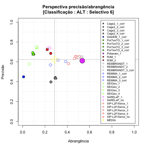 - com tamanho maior, no caso de gráficos comparativos precisão/abrangência e também no caso dos gráficos apenas com medida-F;