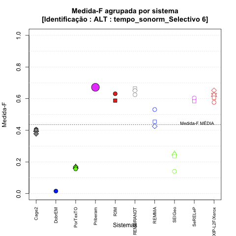 | Saída | Posição (em 13) | Precisão | Abrangência | Medida-F | Sobre-ger | Sub-ger | TotalEMCD | TotalEMSis |