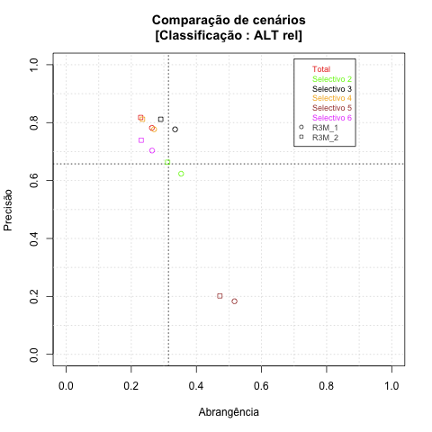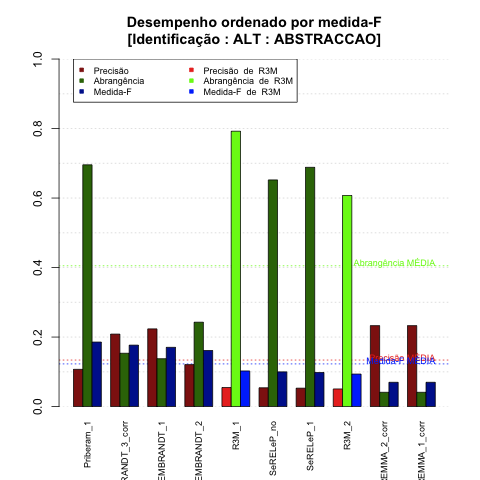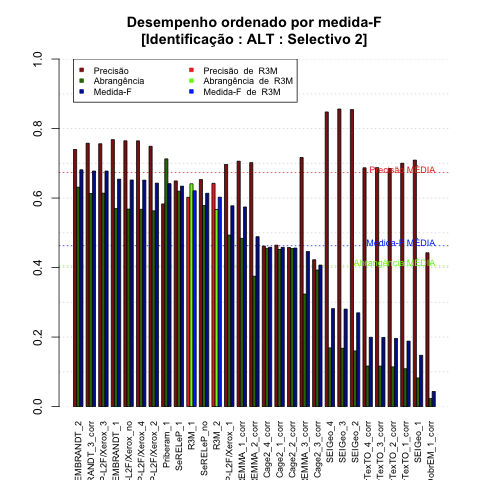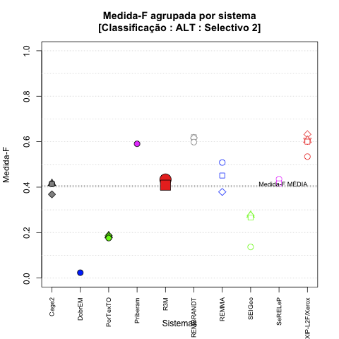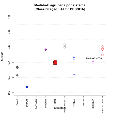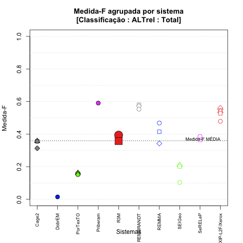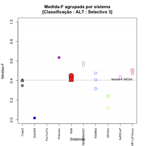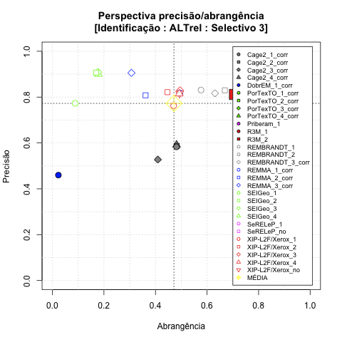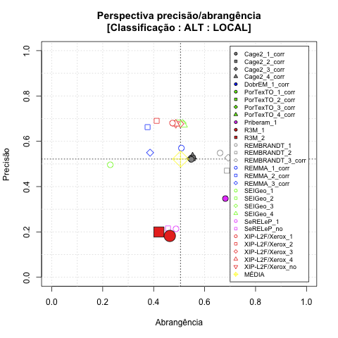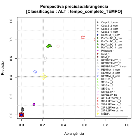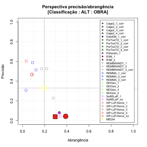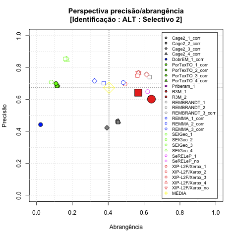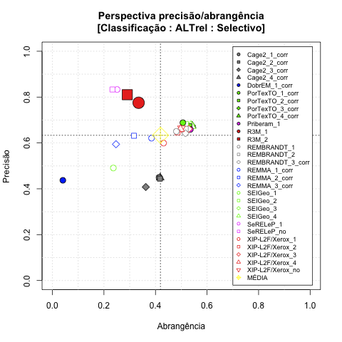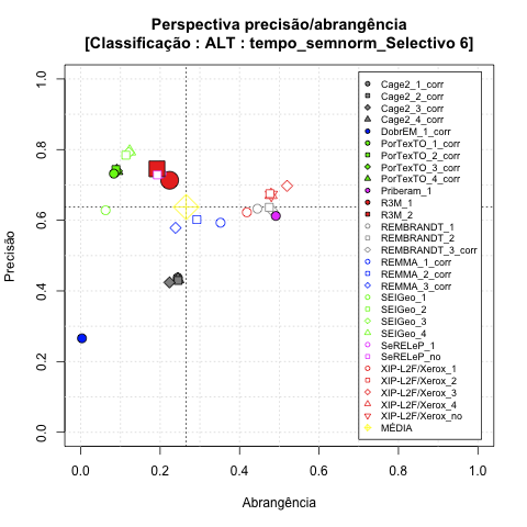 - com tamanho maior, no caso de gráficos comparativos precisão/abrangência e também no caso dos gráficos apenas com medida-F;