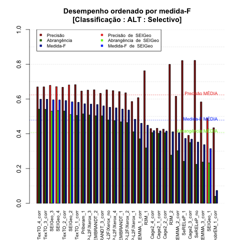 | Saída | Posição (em 29) | Precisão | Abrangência | Medida-F | Sobre-ger | Sub-ger | TotalEMCD | TotalEMSis |