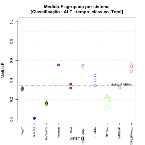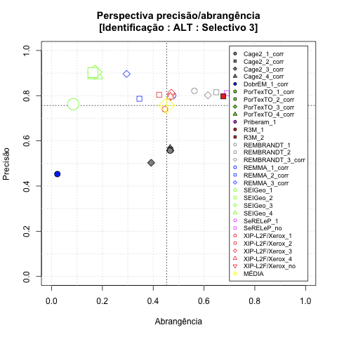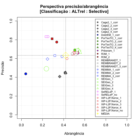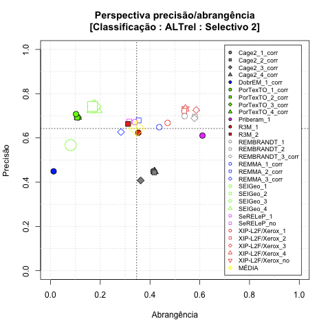- com tamanho maior, no caso de gráficos comparativos precisão/abrangência e também no caso dos gráficos apenas com medida-F;