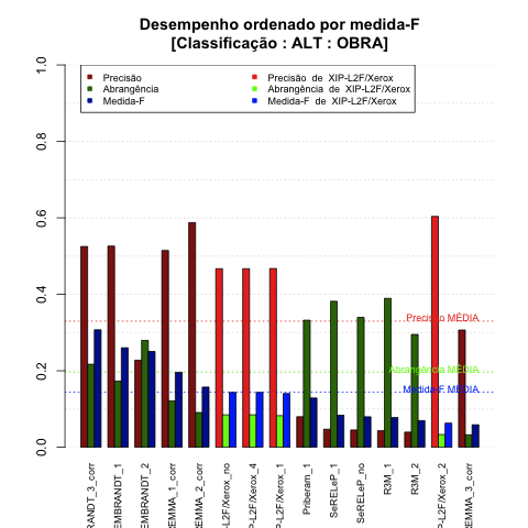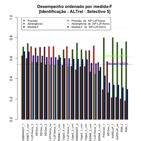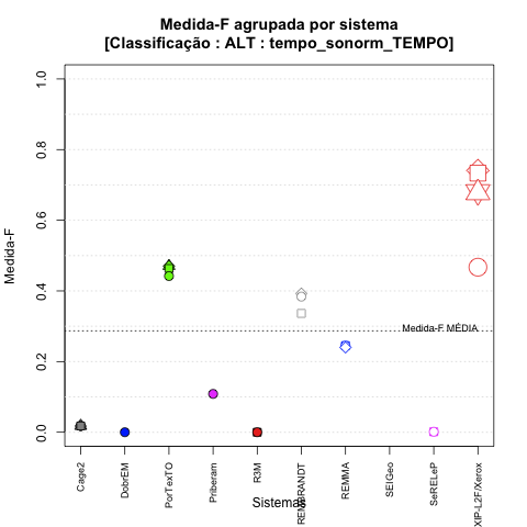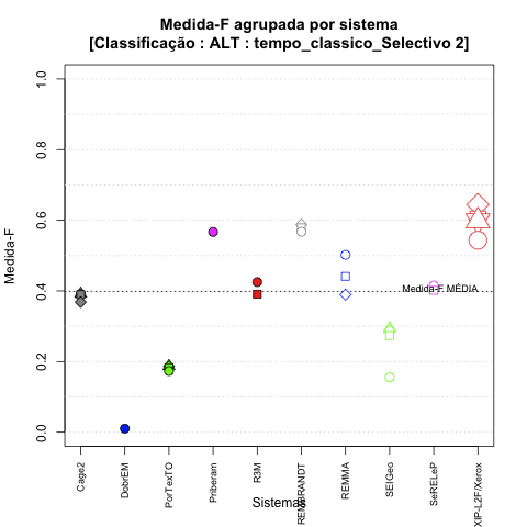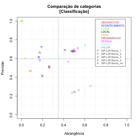 - com tamanho maior, no caso de gráficos comparativos precisão/abrangência e também no caso dos gráficos apenas com medida-F;