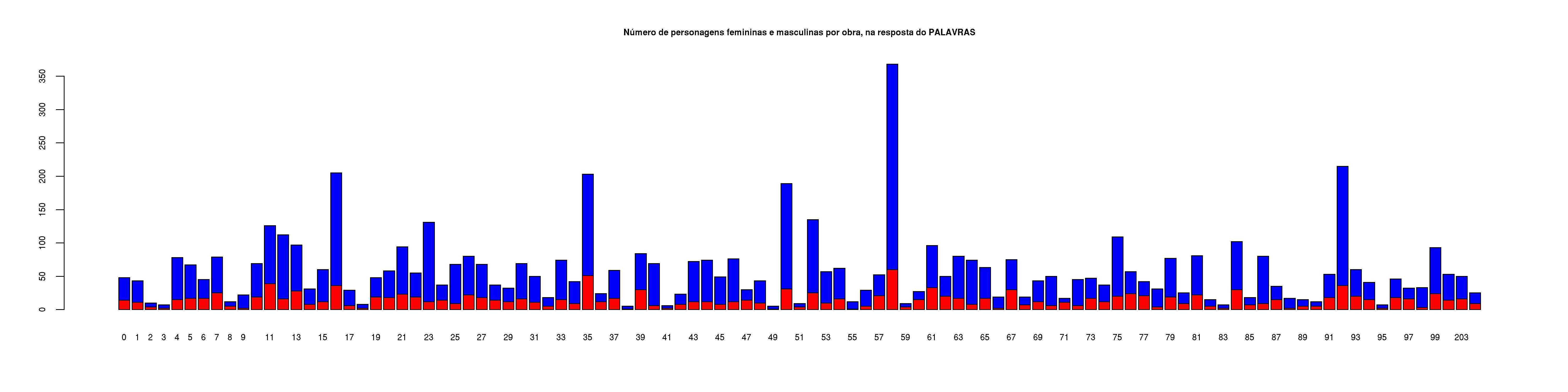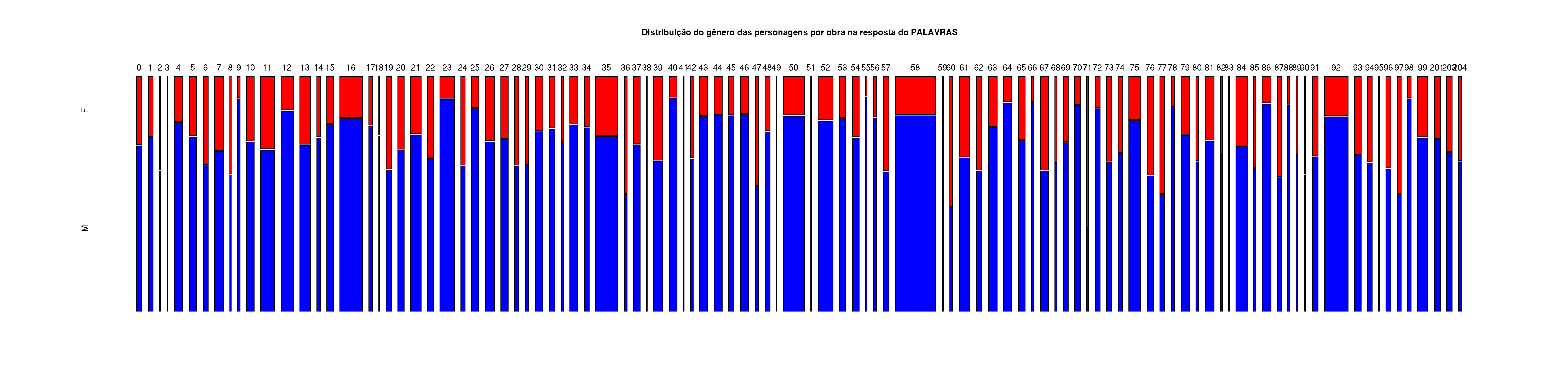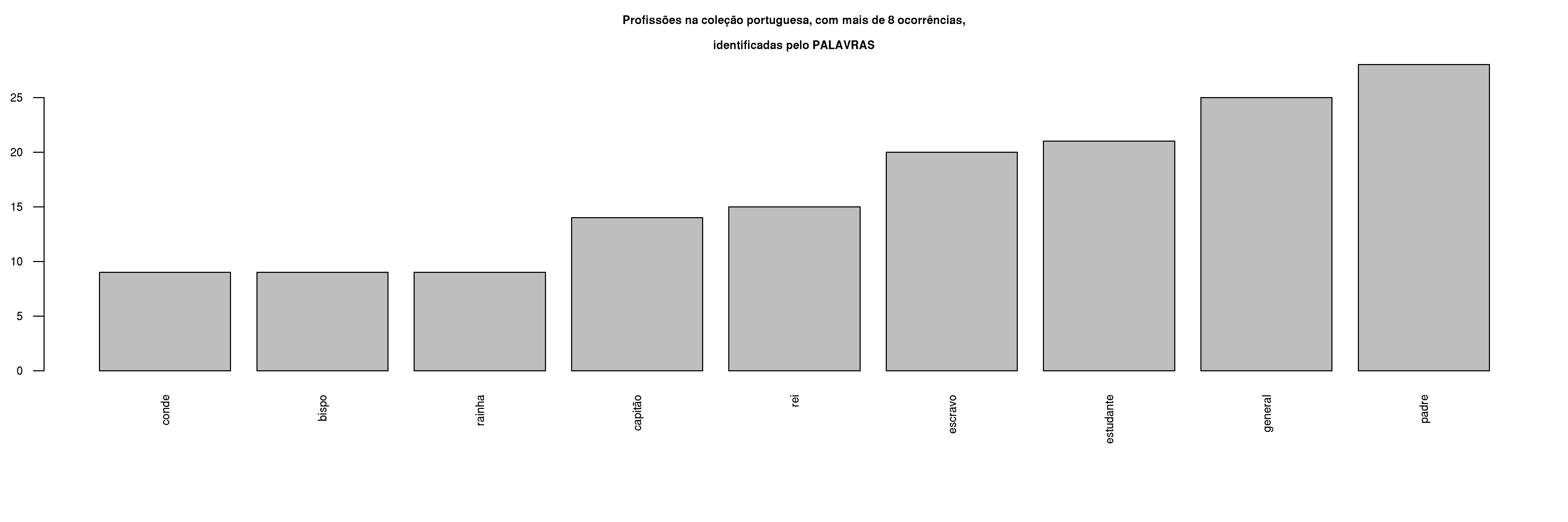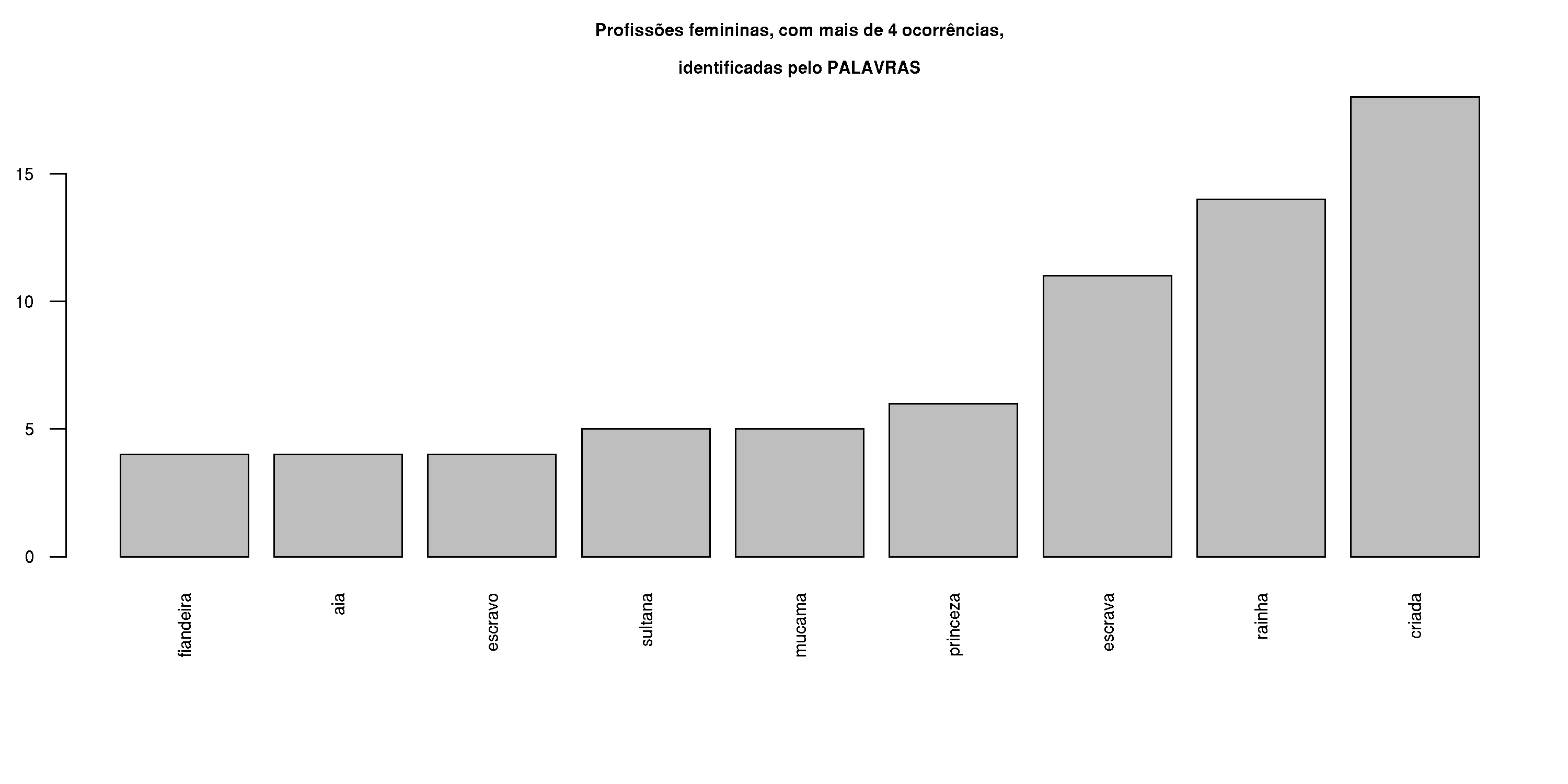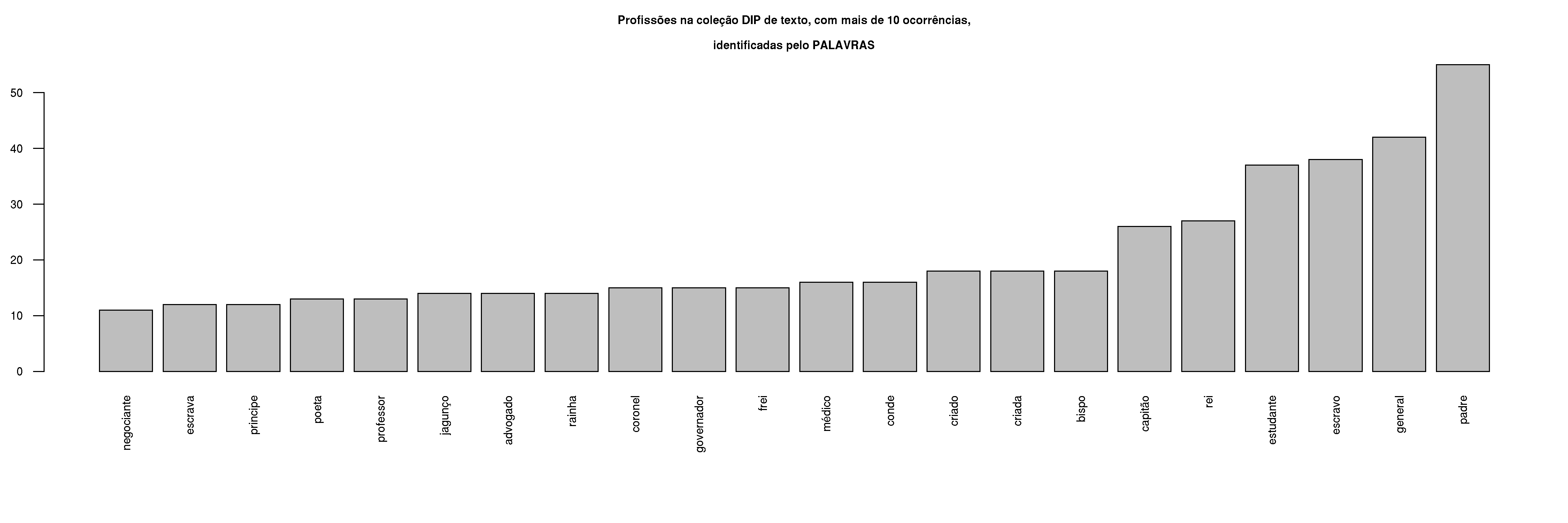 Usando os resultados do PALAVRAS, obtemos 500 profissões distintas (99 femininas distintas e 428 masculinas distintas). Na figura, as profissões com mais de 10 personagens.