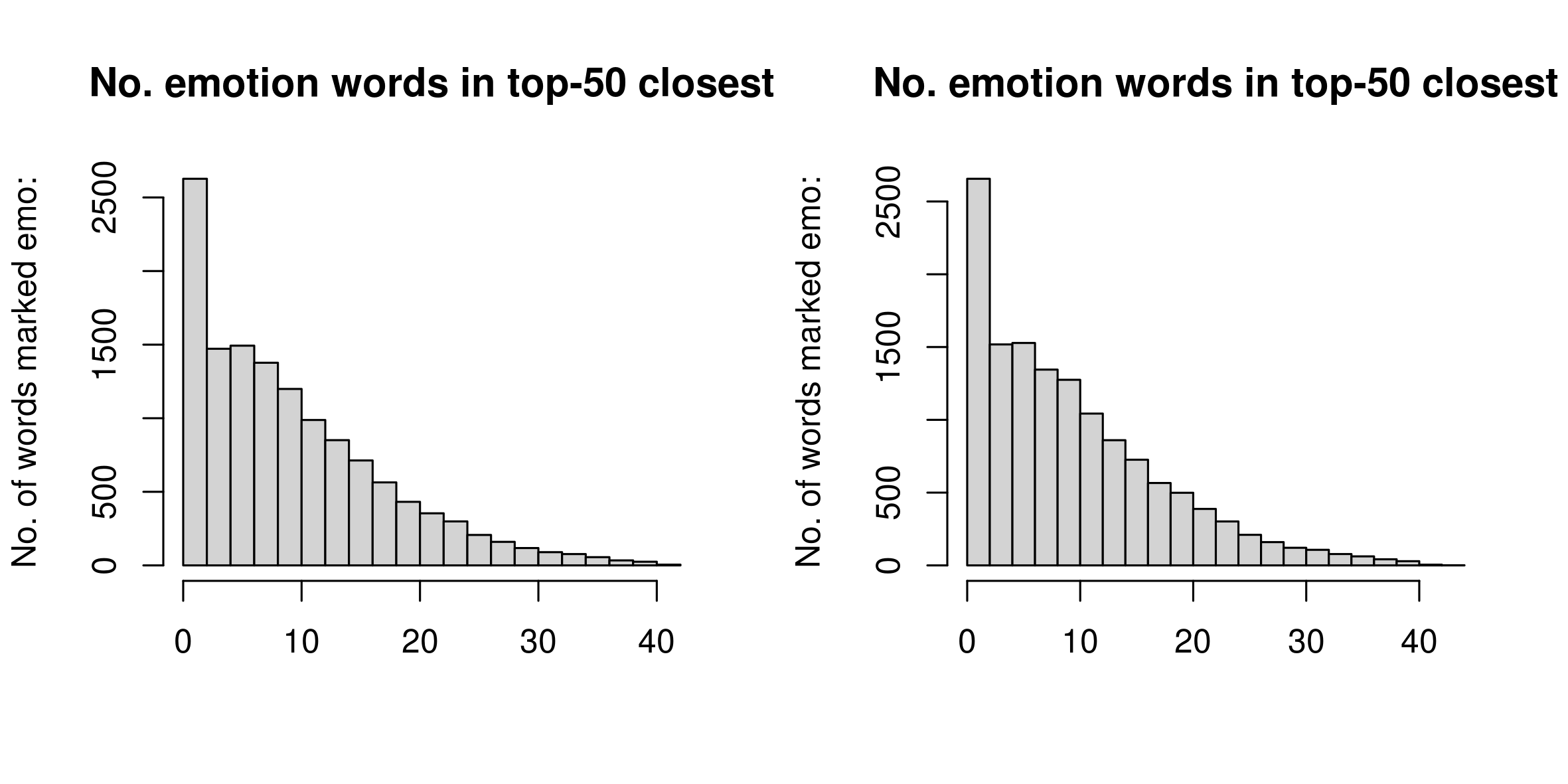 hist(emos3$numeroem50,breaks=20, main="No. emotion words in top-50 closest",xlab="",ylab="No. of words marked emo:")