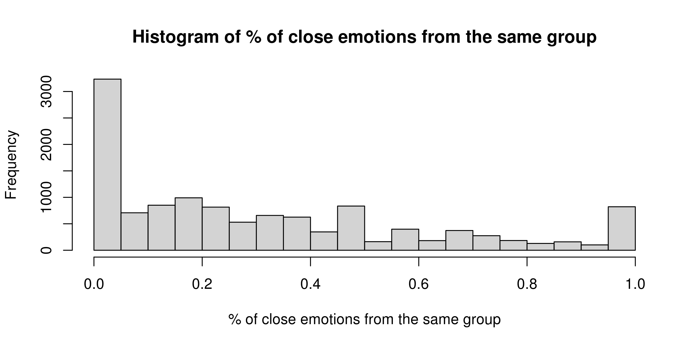 hist(total3$mesmo/total3$numeroem50,xlab="% of close emotions from the same group", main="Histogram of % of close emotions from the same group" )