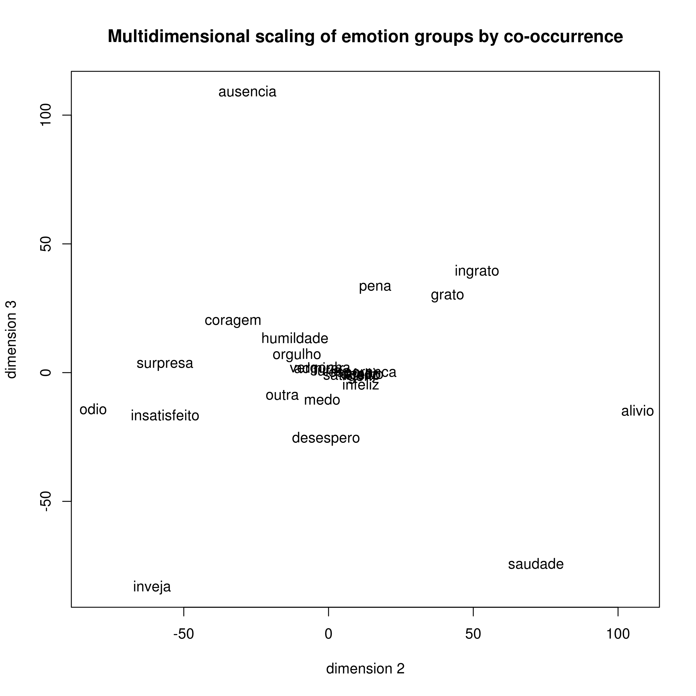 plot(ola$X2,ola$X3, type="n", xlab="dimension 2", ylab="dimension 3",main="Multidimensional scaling of emotion groups by co-occurrence")